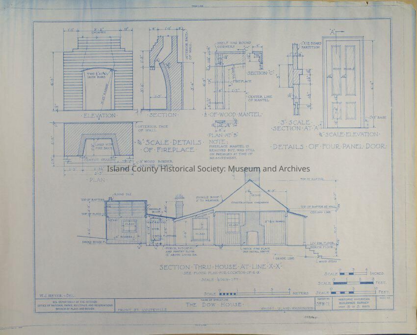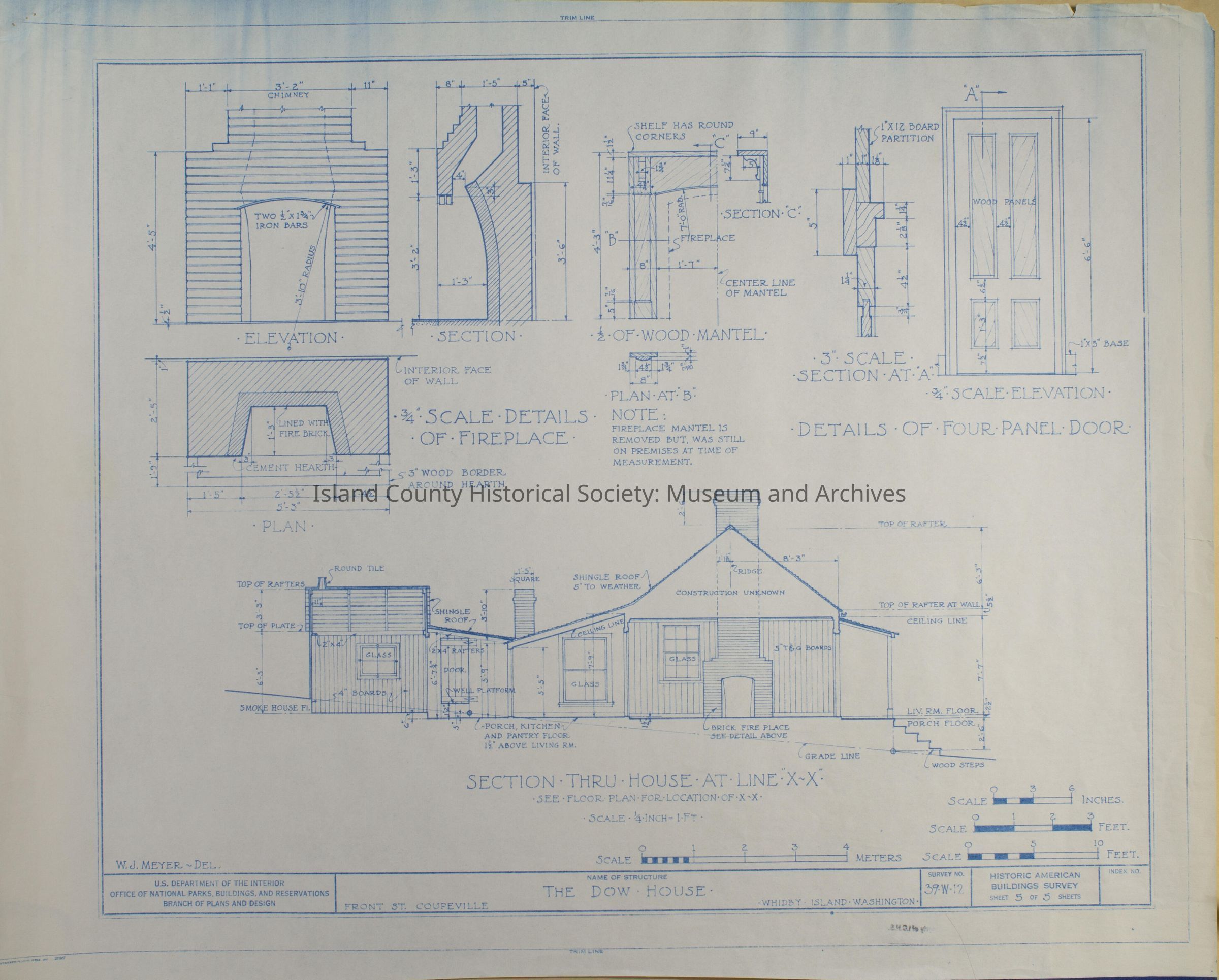 Architect Drawing of the Dow House. Details of Fireplace and Wood Mantel, 4 Panel Doors, Sections through House. Survey No. 39-W-17 - Sheet 5 of 5.