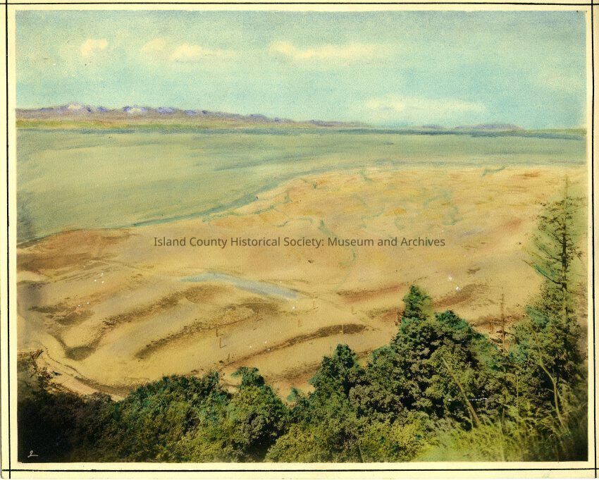 Color photo of a beach from the bluff - distant coast across the water. Bluff with mostly trees. Might be buildings on land across the water.