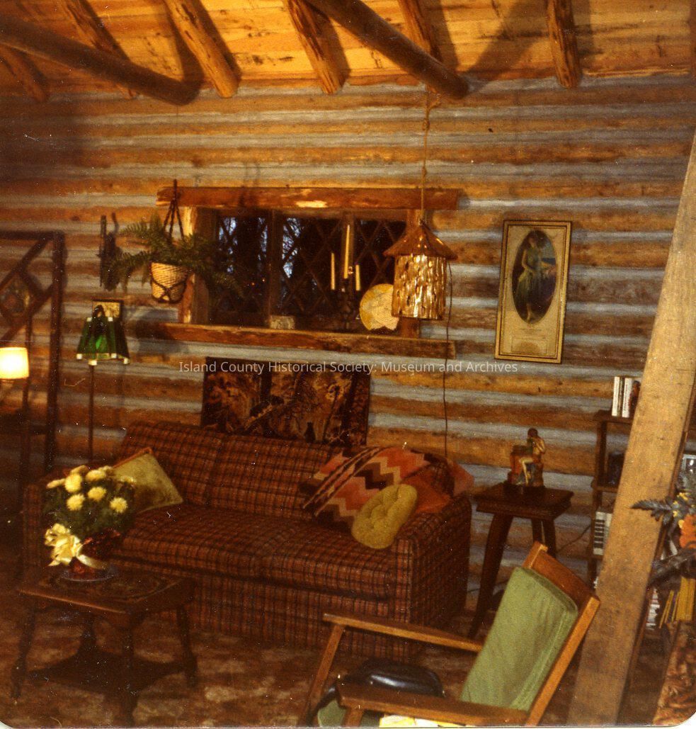 Guest House Bed & Breakfast, Greenbank. Interior of "Hansel and Gretel" log cottage. Log walls with chinking and log rafters. Plaid couch sits below rectangular lead pane window. Small coffee table with plant, side table, rocking chair, bookcase. Hanging and standing lamps. Picture and objects hanging on wall.Made/Created