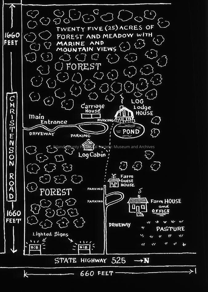 Guest House Bed & Breakfast, Greenbank. Drawing of layout of business with Christenson Road on left and State Hwy 525 on bottom. From top: "Twenty five acres of forest and meadow with marine and mountain views. Main entrance from left to Carriage House, Log Lodge House and Pond and Log Cabin. Drieveway from Highway with Farm Guest House, Farm House and Office, Pasture, Forest, and Lighted Signs.Made/Created