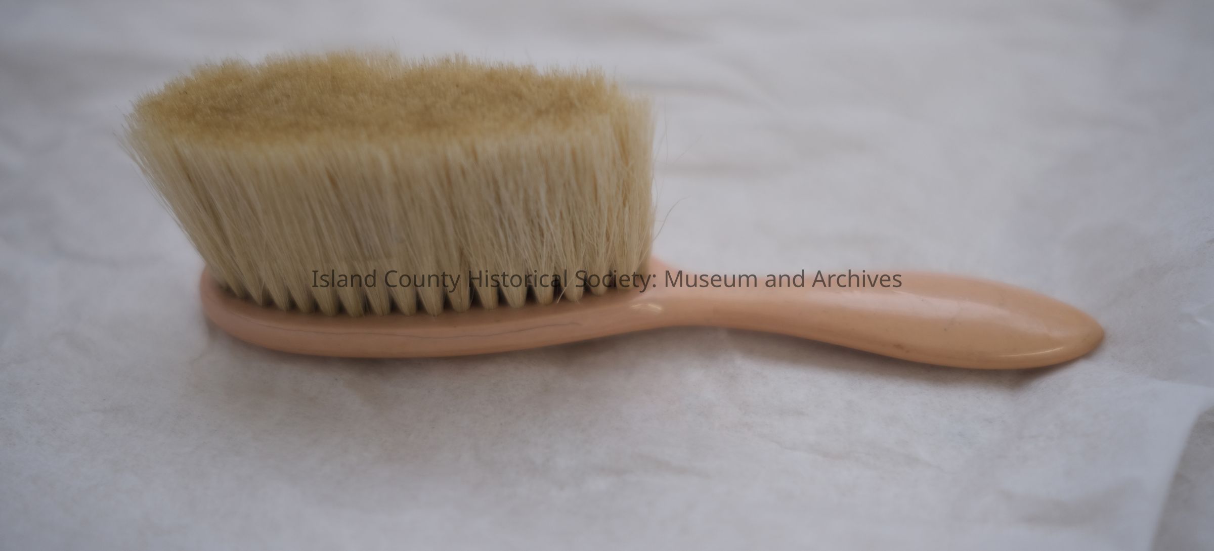 Infant's small, soft bristled hairbrush. Handle is pale pink
