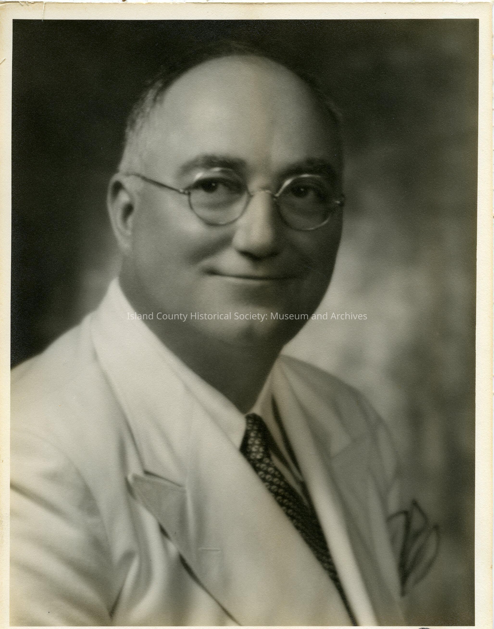 Black & white portrait photograph of Harry Fullington. He is a smiling, bald, middle-aged man with round eyeglasses. He is wearing a light colored suit jacket, white shirt, and tie. The photograher's name, Terry Ogden, is written on the lower right margin.