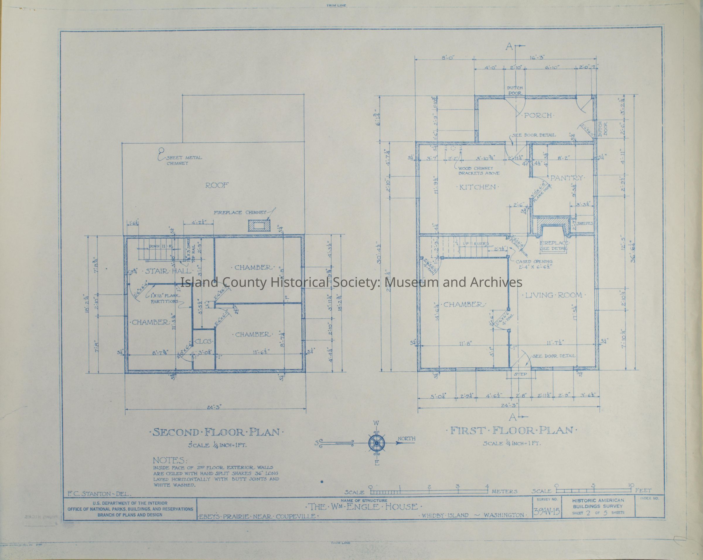 Architect Drawing of the Wm Engle House, Ebey's Prairie, Coupeville. First & Second Floor Plans. Survey No. 39-W-15, Sheet 2 of 5