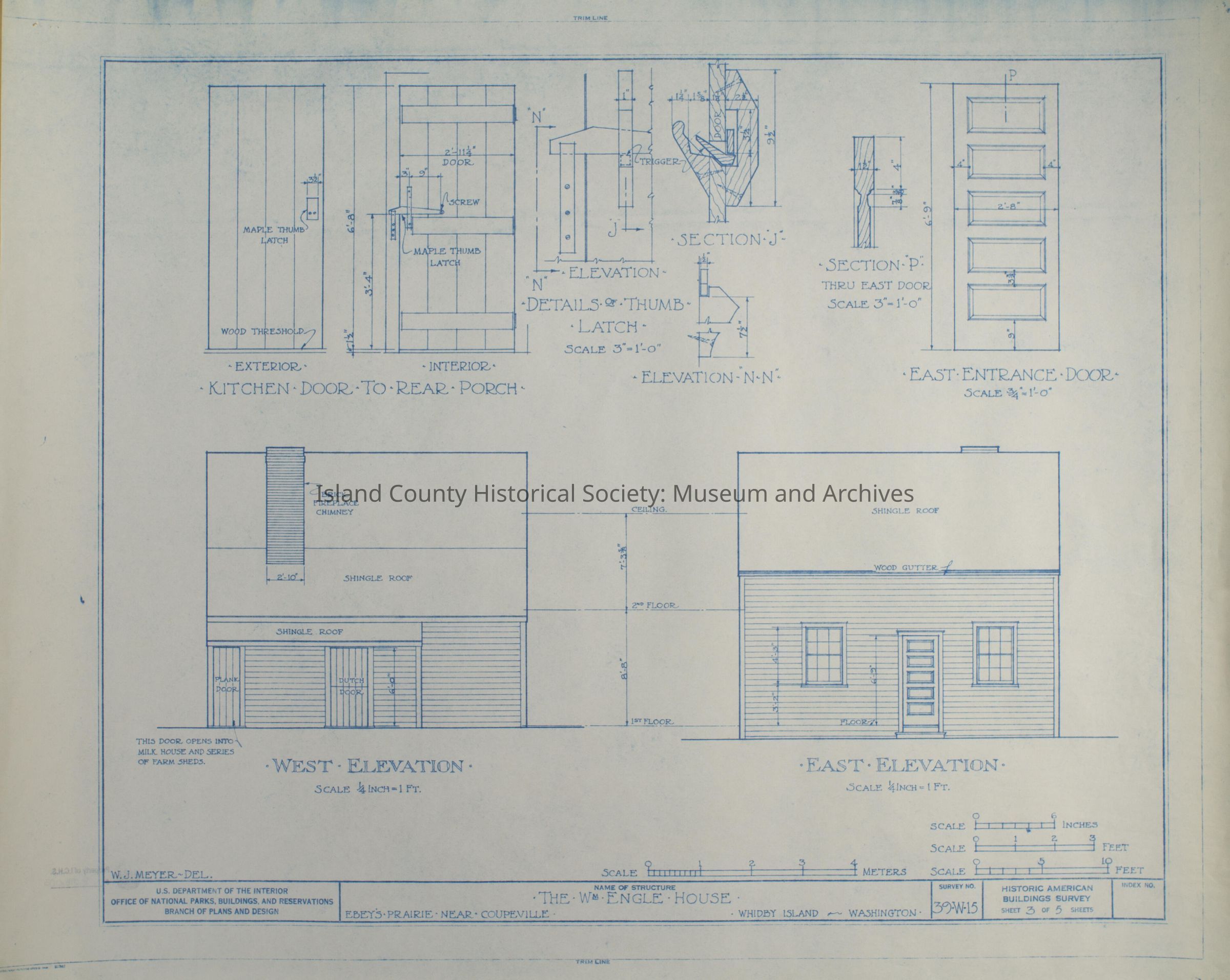 Architect Drawing of the Wm Engle House, Ebey's Prairie, Coupeville. East & West Elevations, Kitchen Door, East Entrance Door. Survey No. 39-W-15, Sheet 3 of 5Lexicon