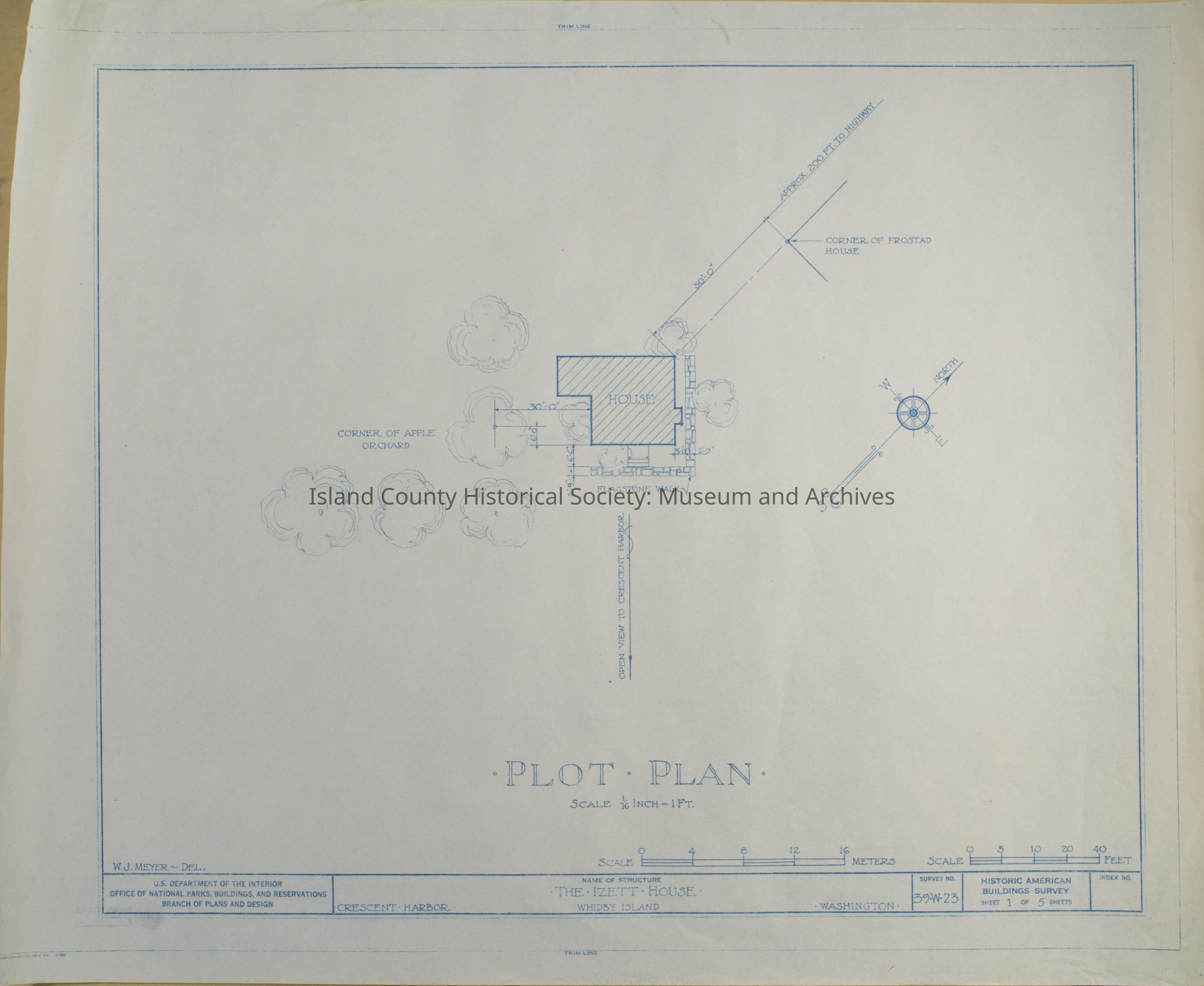 Architect Drawing of the Izett House, Crescent Harbor. Plot Plan. Survey No. 39-W-23, Sheet 1 of 5.