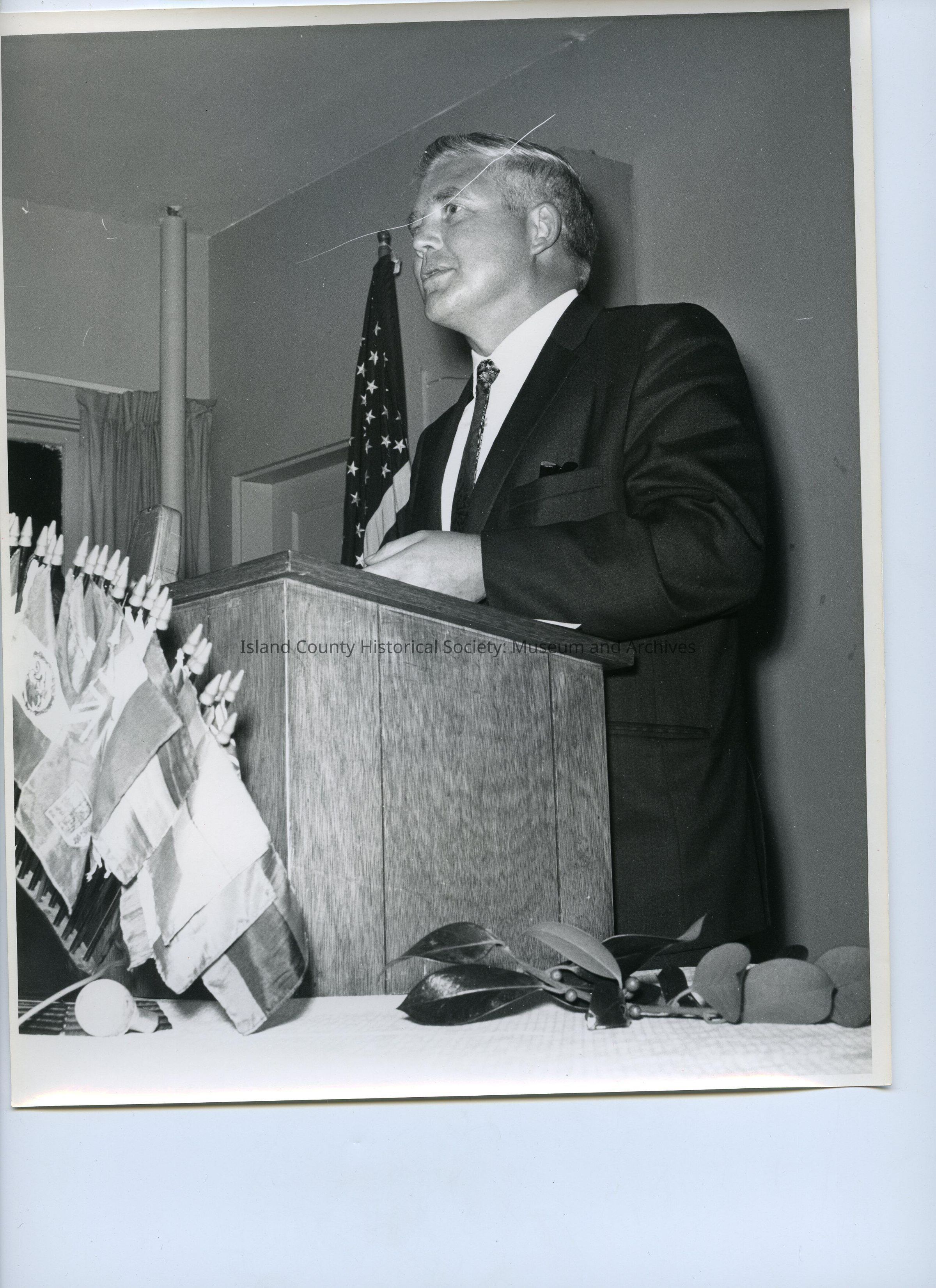 A black and white photo of a man standing at a podium. The man is wearing a black suit with a tie. It appears as if the man is looking at an audience. There is a table with many small flags on it. There is an American flag in the background. The post-it on the photo says, "Unknown, ca 1967".