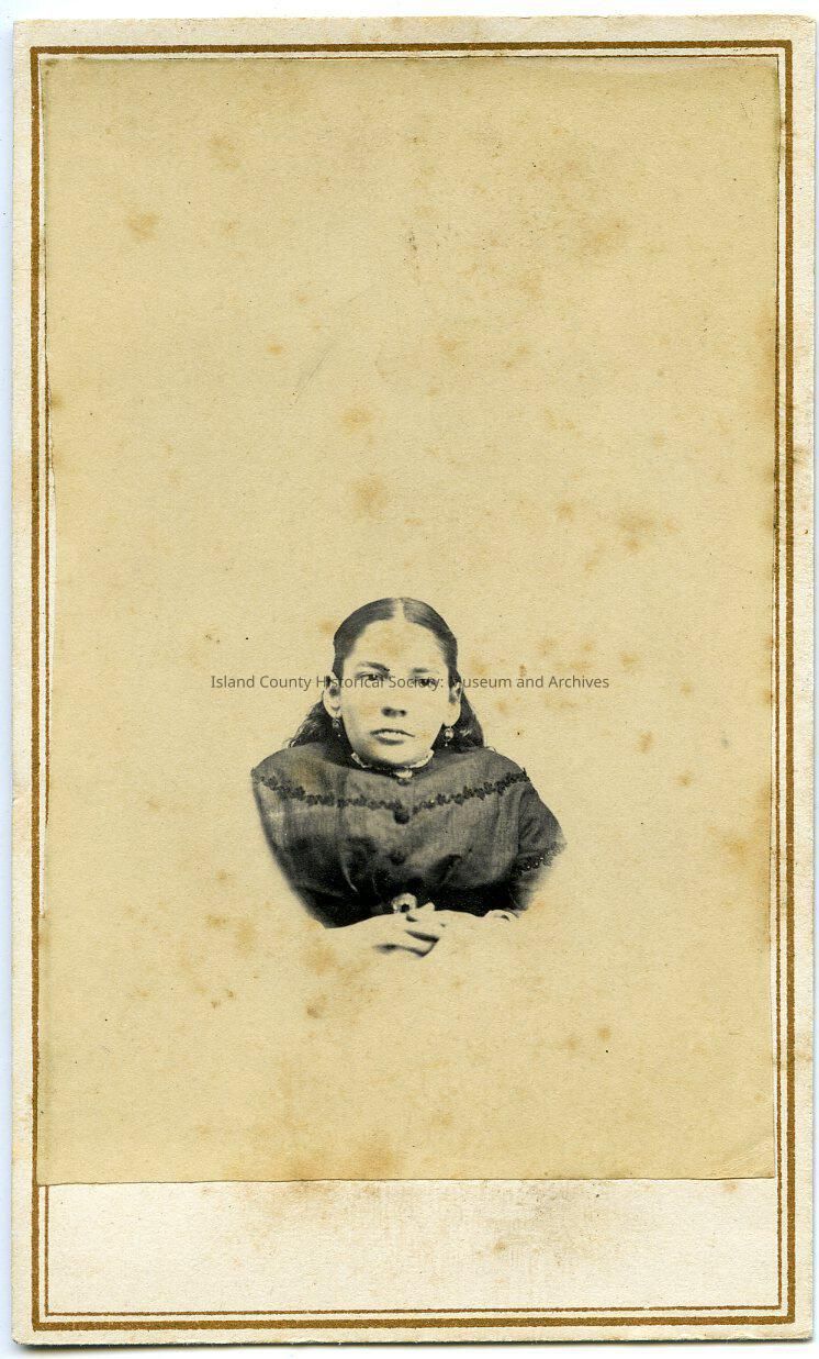 A photo of a woman. A handwritten note on the front says "Aunt Jennie from Coupe Fam. Album 13, May 30, '73."