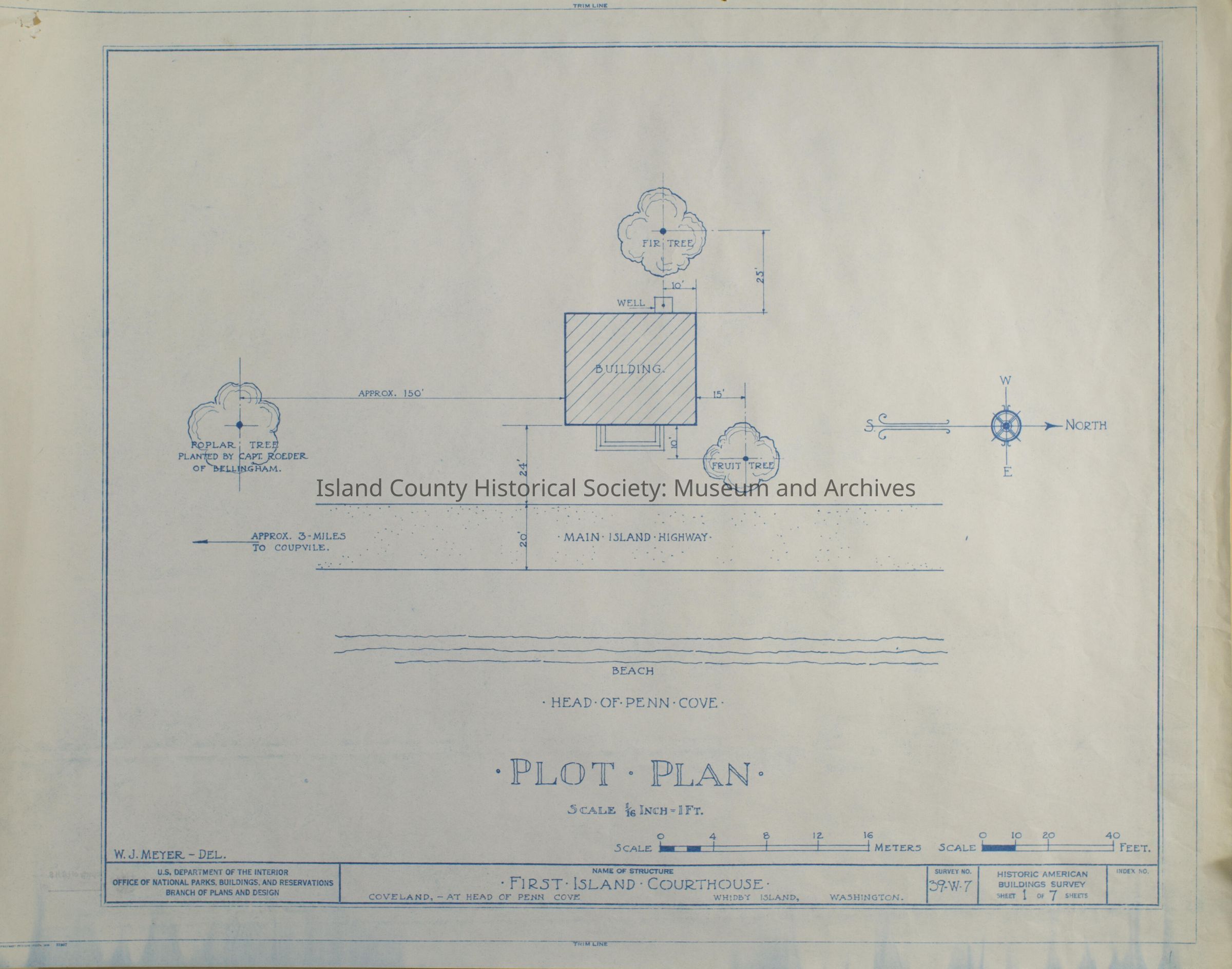 Architect Drawing of the first Island County Court House, Plot plan. Survey No. 39-W-7, Sheet 1 of 7.
