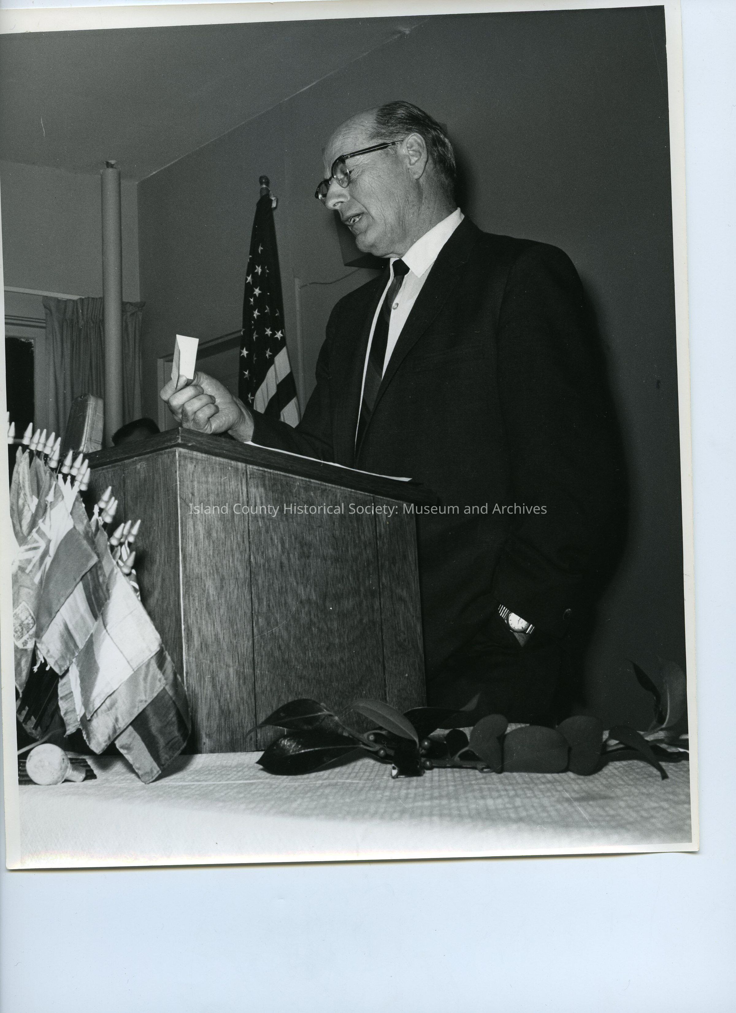 A black and white photo of a man standing behind a podium. The man is talking while looking at a small piece of paper in his right hand, He is wearing a black suit and tie, a watch on his left wrist, and glasses. There are many small flags on the table in front of the podium. There is also an American flag in the background. The post-it on the photo says, "unknown, 1967".Lexicon