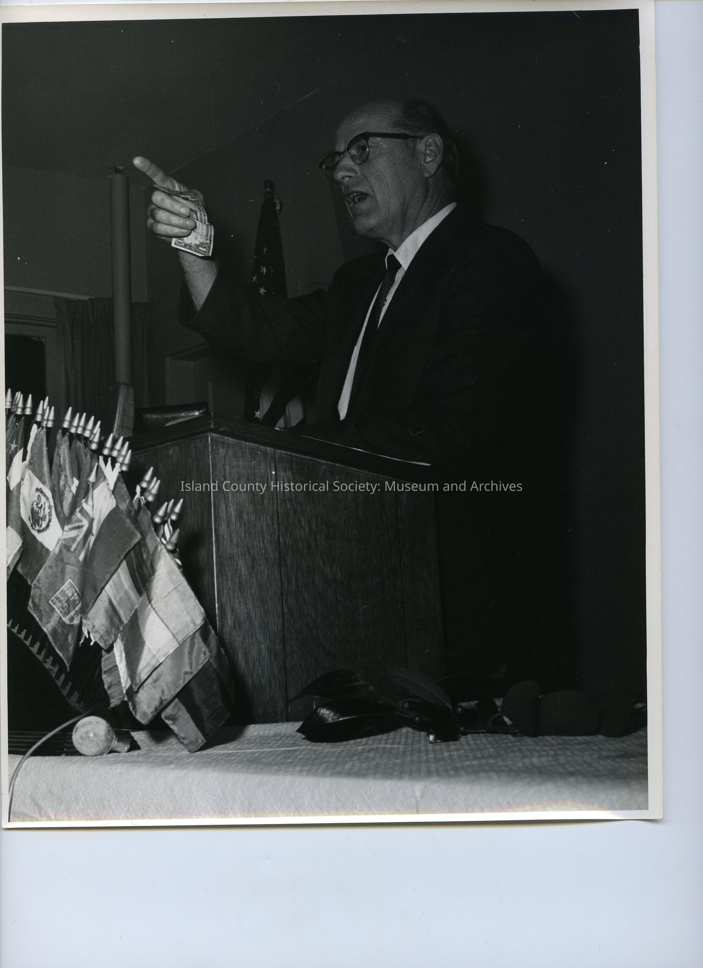 A black and white photo of a man standing behind a podium. The man is talking while pointing his index finger out to the crowd. With the same hand he is pointing with, he is holding a dollar bill. The man is wearing a black suit, tie and glasses. The table in front of the podium has many small flags on it. There is an American flag in the background. The post-it on the photo says, "not known, ca 1967".Lexicon