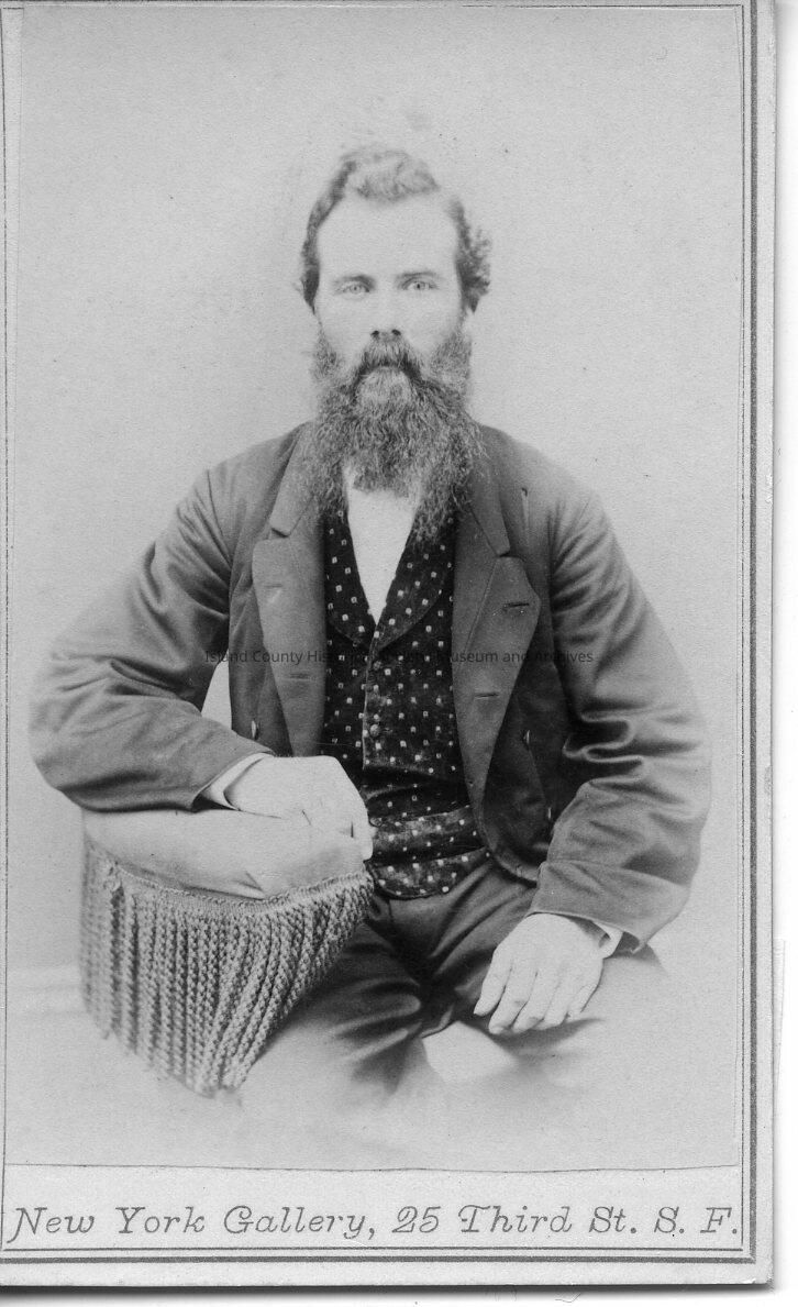 A photo of a man sitting. A handwritten note on the front says "unknown man from Coupe Family Album 13. NY Gallery, San Francisco, Cal."