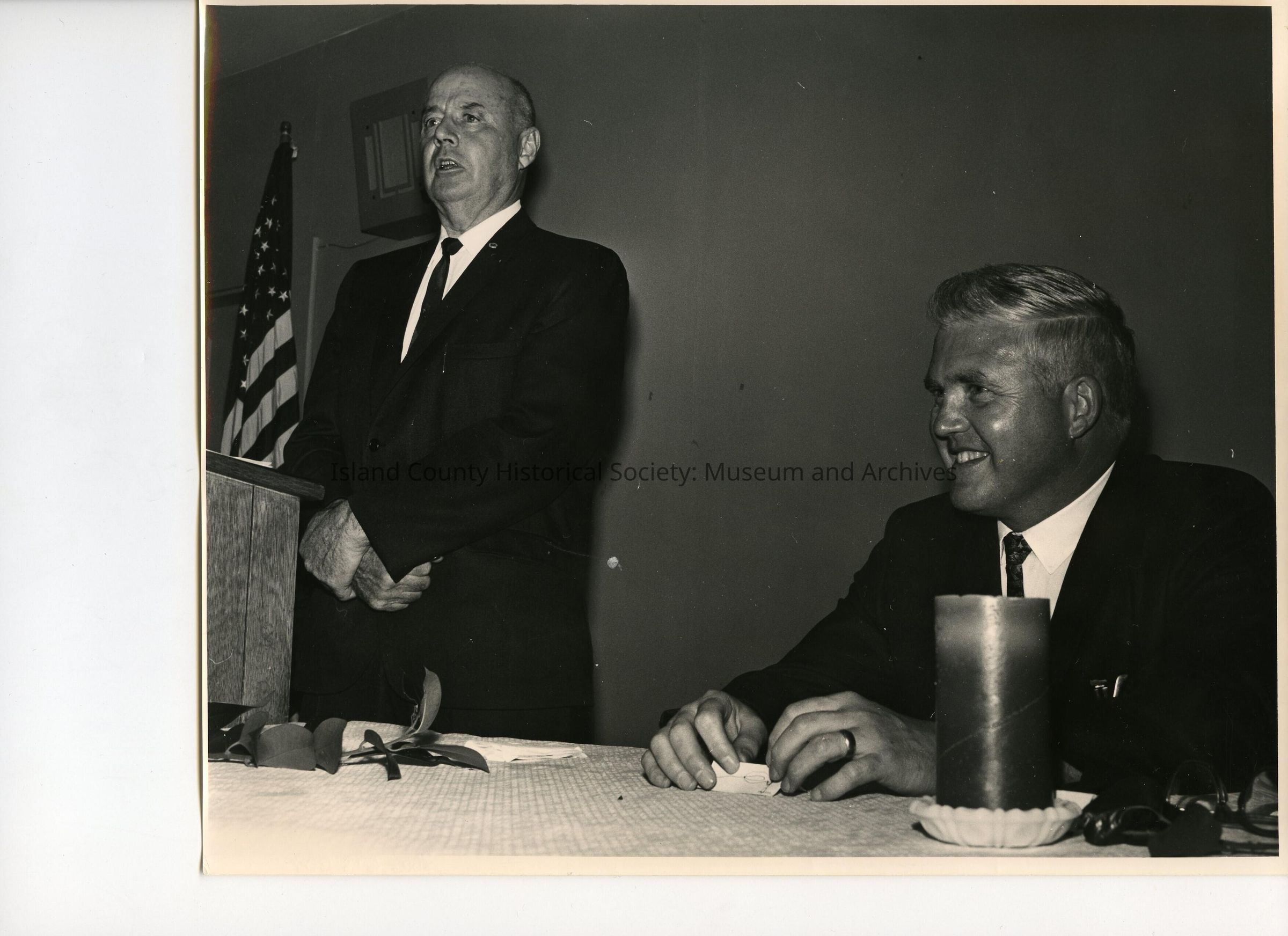 A black and white photo of two men. The man on the left side of the photo is standing behind a podium. The man on the right is sitting on the table next to the podium. Both men are wearing black suits and ties. The man who is standing appears to be talking. There is an American flag in the background. The post-it that is on the standing man says, "Wilbur Sherman, CA 1967".