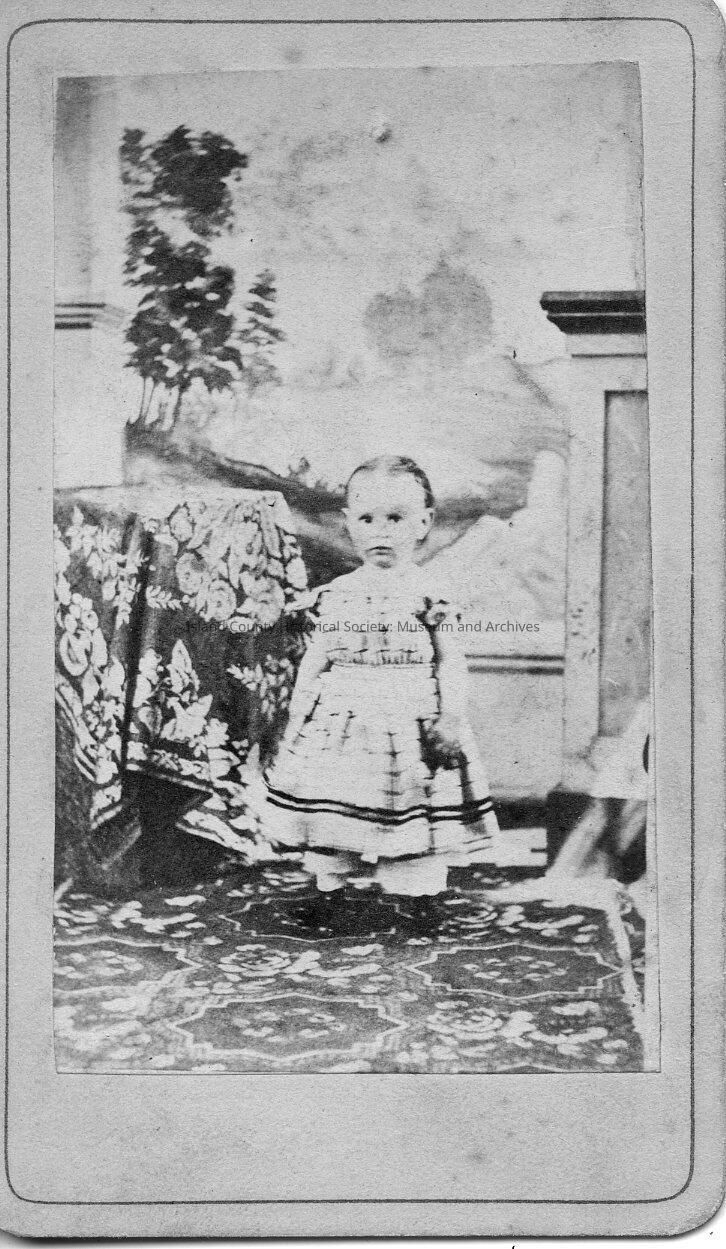 A photo of a young girl standing by a table. The note on the back says "Mary "Mollie" Coupe from Coupe Family Album. 'Mary Coupe, Coupville, May 31, '73. Is this Molie Cranney Clapp, w/o Jos W Clapp? Instead? Id uncertain 4/8/13."