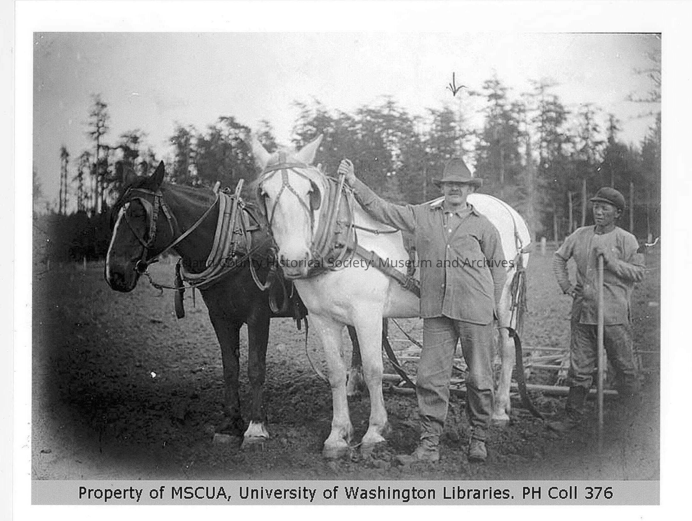 Sam Hancock, with Chinese man and Team of Horses. Photo marked "Property of MSCUA, University of Washington Libtaries. PH Coll 376"