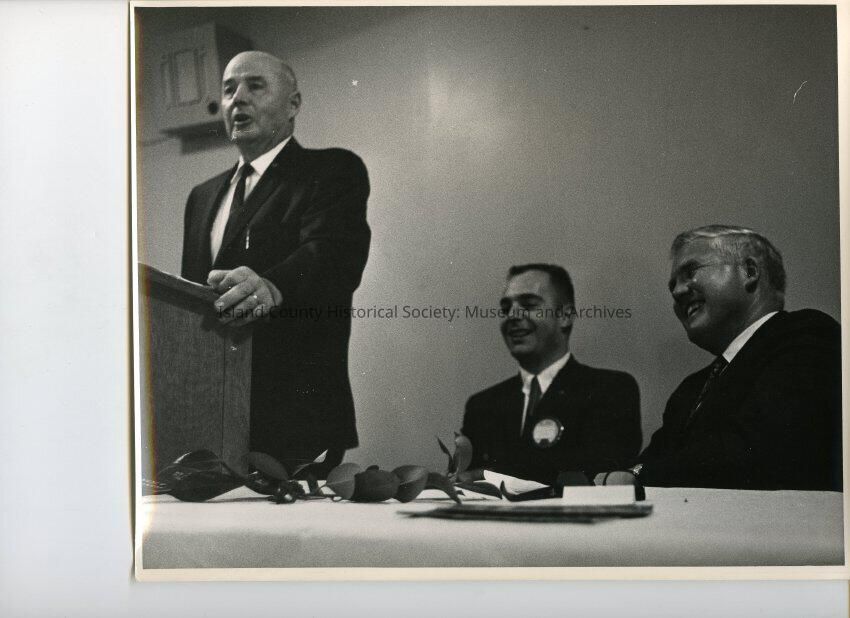 A black and white photo of a meeting. There are two men sitting at a table beside a man standing at a podium giving a talk. All are wearing suits and ties. The man at the podium is Wilbur Sherman. The man in the center is Frank Cratsenberg. Names and date are on sticky notes. (same photo as 2016.095.016 except sticky notes says 1964)
