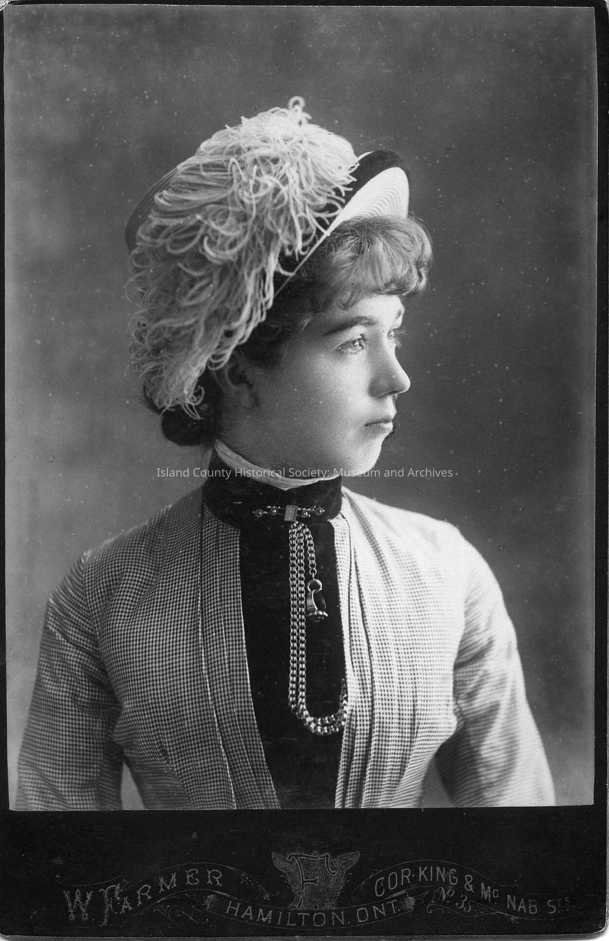 A photo of a young woman, wearing a hat. In a note on the front is says "Unknown woman, from Coupe Family Album 13. Farmer's Artisic Studio, Hamilton, Ont."Made/Created