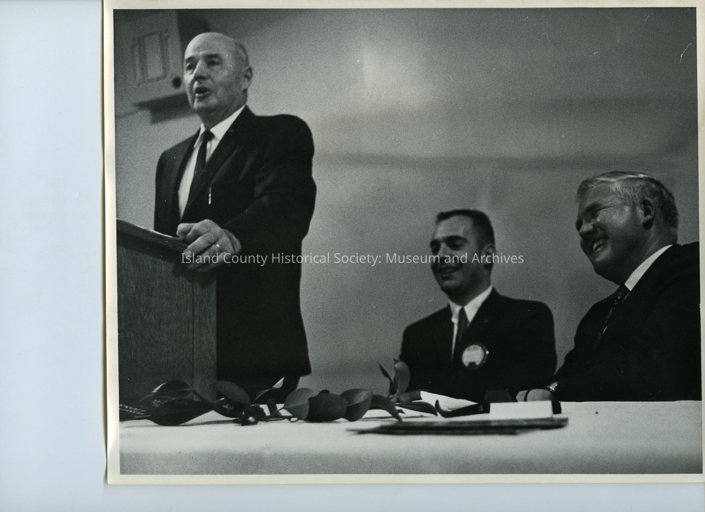 A black and white photo of three men (same as in 2016.095.011; note on that photo states 1964) in suits; one at a podium the other two sitting at a table. Sticky notes: Wilbur Sherman 1967 (man at podium); Frank Cratsenberg (arrow to man in center)