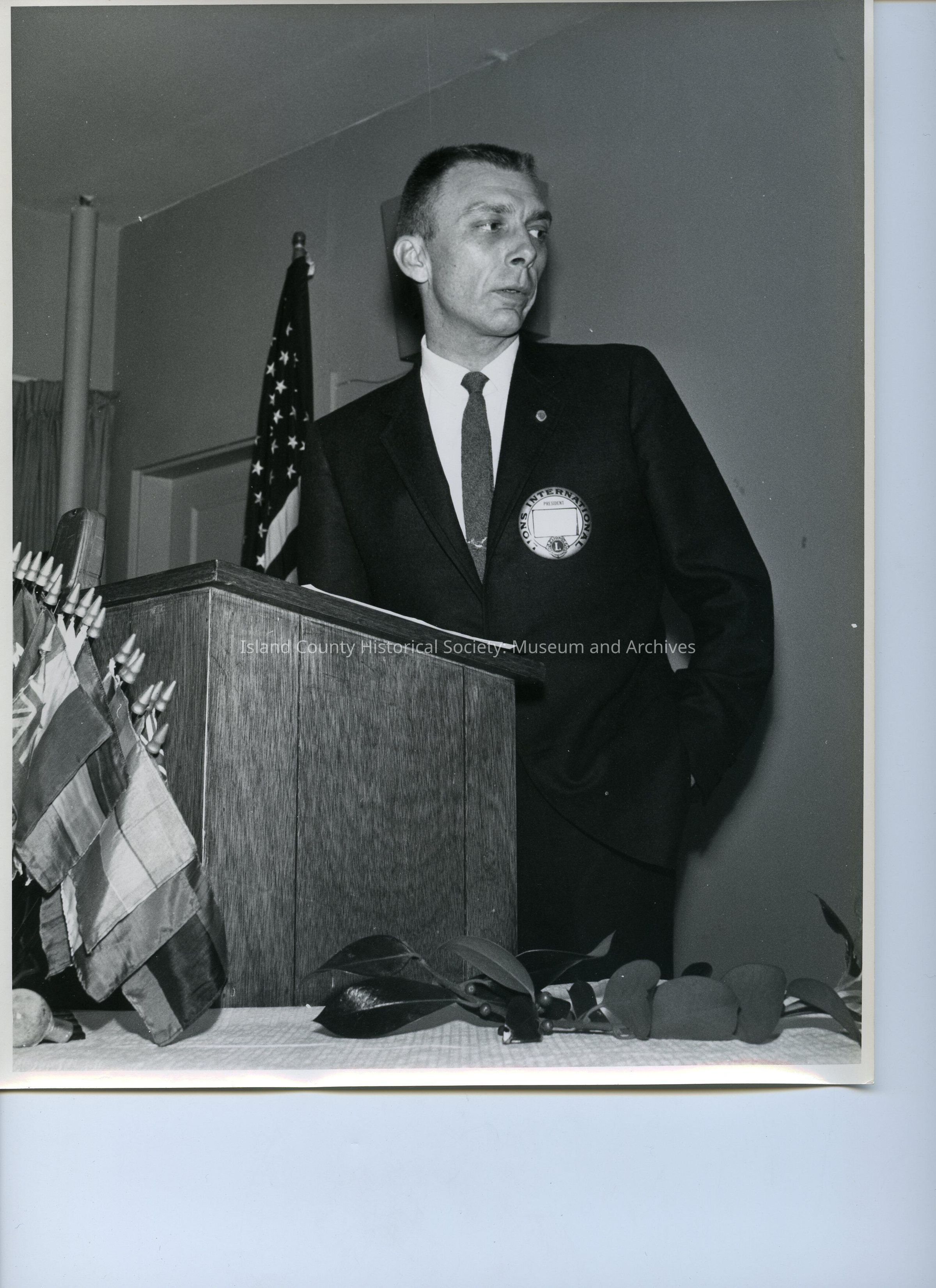 A black and white photo of a man in suit and tie standing at a podium with the American flag behind his right shoulder and small flags at the front of the podium. Sticky note: Roger Sherman 1967 (probably mislabeled based on other photos in this series). On back: "Roger Johnson Pres. W. I. Bank"