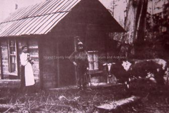 Photograph of two individuals, a man and woman, standing outside their home with a cow. The woman (left) is holding a cat. Likely c. early 1900s.