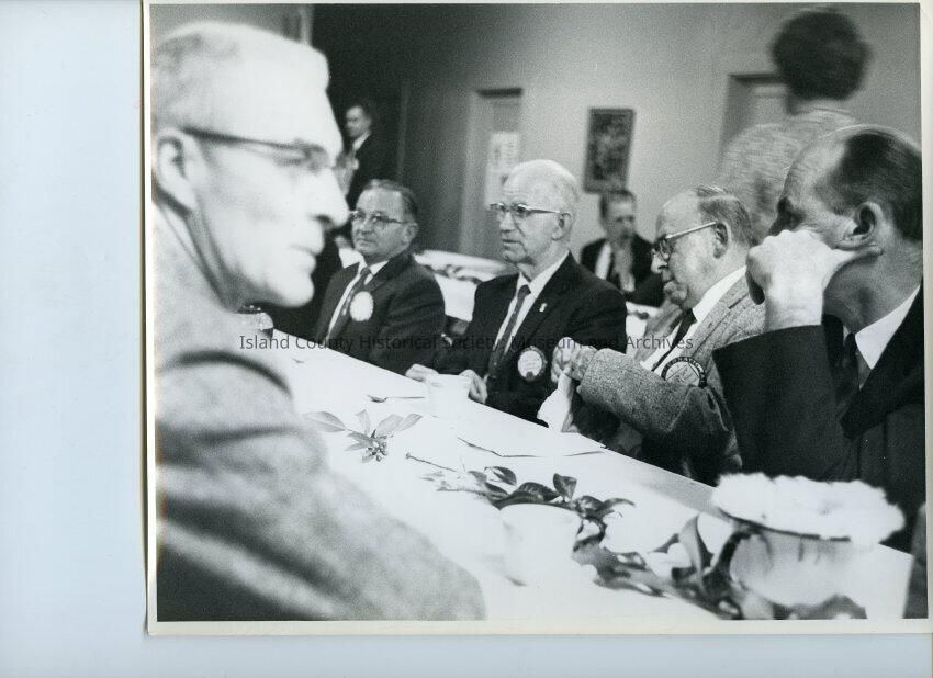 A black and white photo of a group of men in suits, ties sitting at two long tables. Sticky notes point to Ron VanDyk, John Owner?, Carl Dean 3rd from left