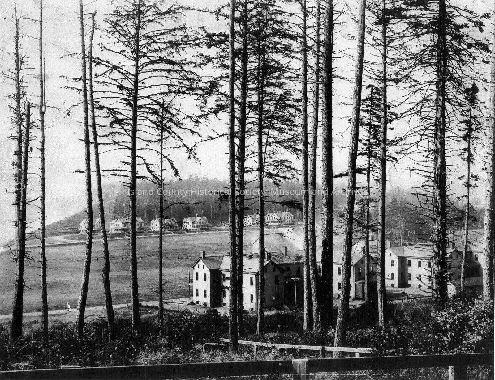 Early Fort Casey. Original photo part of the Darst family photos. Image taken from the latrine half way down the hill from the lighthouse. Camera facing north. Back of the enlisted company barracks, parade ground and officers row. SJK