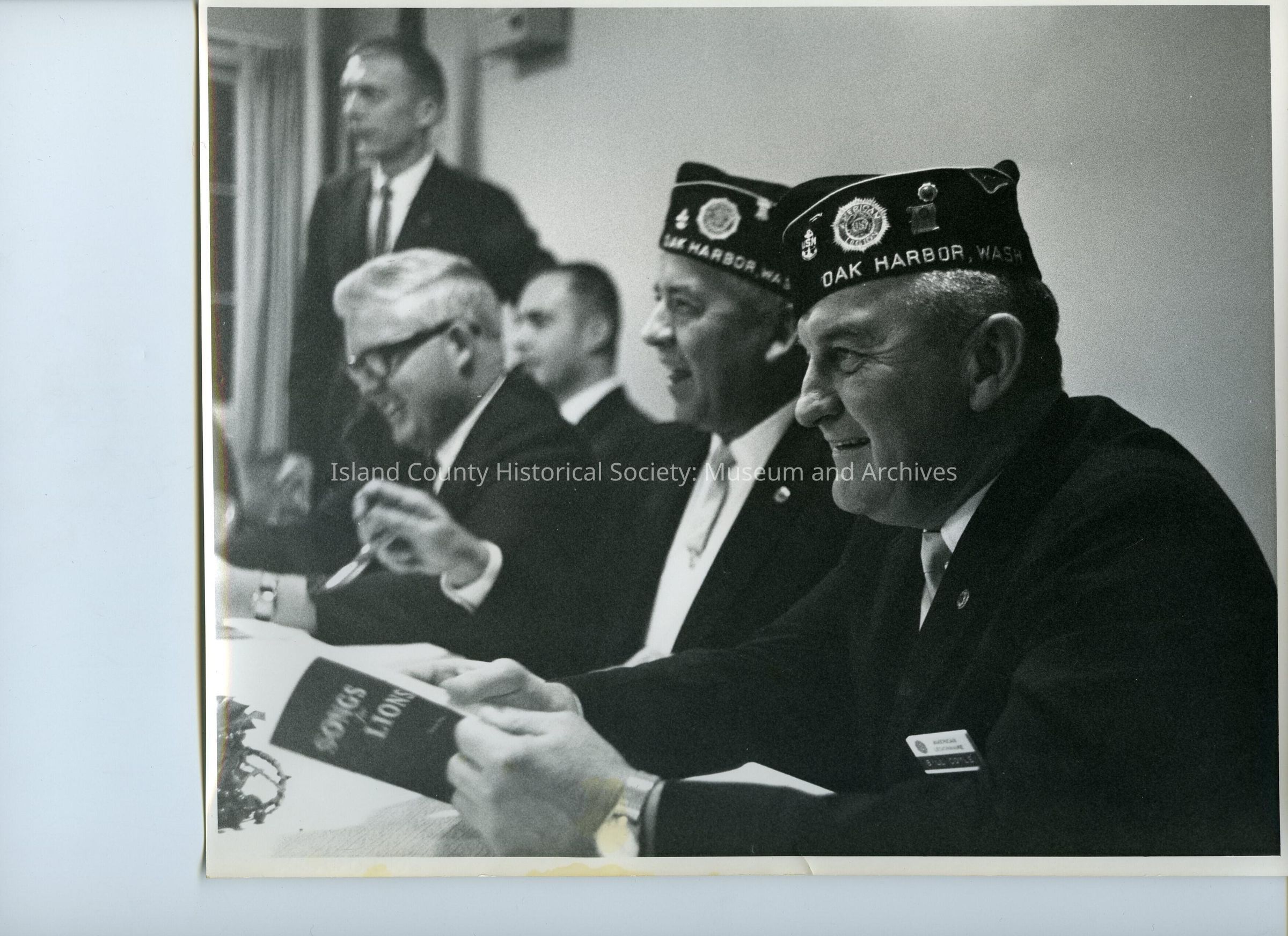 A black and white photo of a group of men in suits, ties sitting at a long table. Two are wearing American Legion hats and jackets. Sticky notes point to Roger Johnson cn 1967 rest unknown, another note: Bill Coyle Oak Harbor American Legion.
