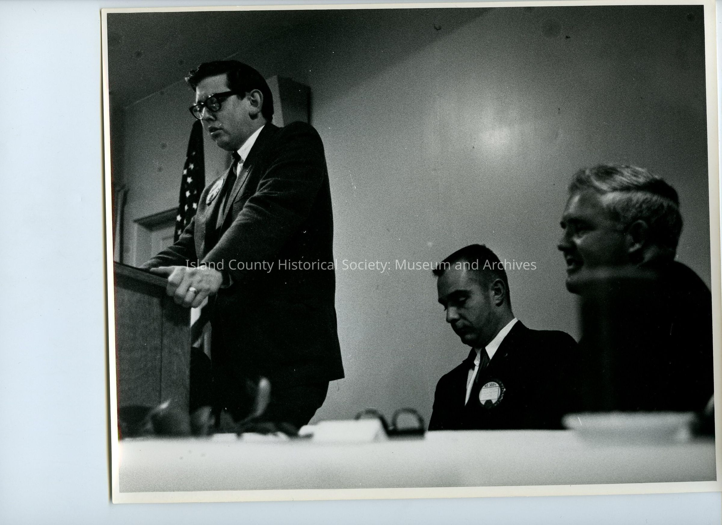 A black and white photo of a man at a podium with two men sitting at a table. They are wearing suits and ties. Sticky notes: (one pointing to man in center) Frank Cratsenberg; Other note (pointing to man at podium) Don Sorensen ca 1967, (other man) unknown.