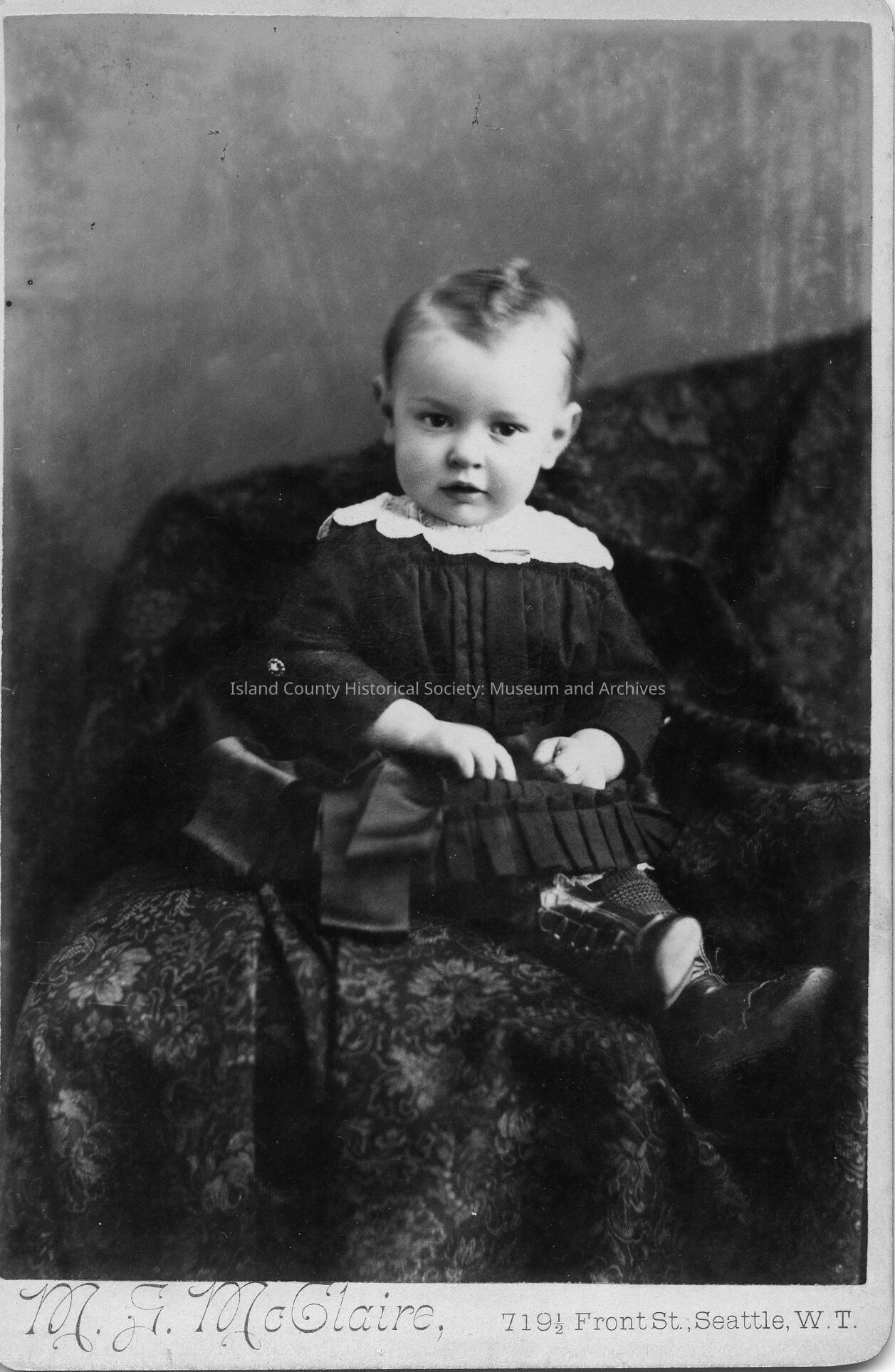 A photo of a little girl. She is sitting on probably a sofa with a flowered cloth draped over the arm and back. She is wearing a dress with pleats and a large bow, white wide collar and high-top shoes. A note on the front says "5A. Georgie Gimbert (?). Mary Coupe Fam. Album 14. M.S. McClaire, Seattle, W.T."Made/Created