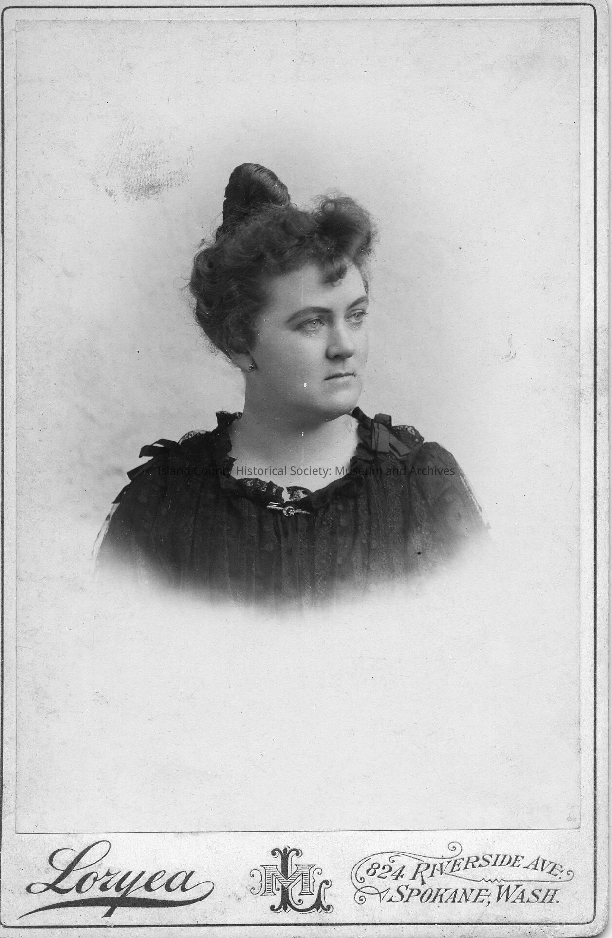 A photo of a woman. A note on the front says "Unknown Woman from Coupe Family Album 13. L&M Souvenir Gallery, Spokane."