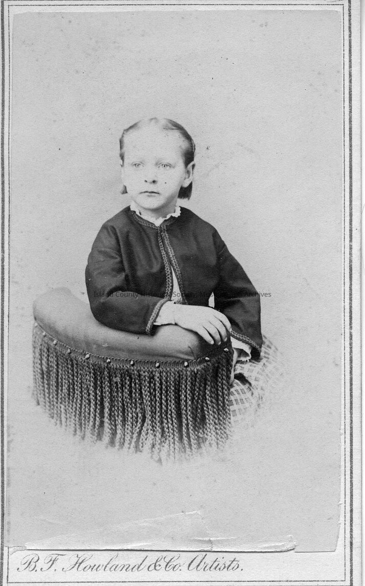 A photo of a young girl. A note on the front says "Unknown girl, from Coupe Family Album 13. ' Mary Coupe, Coupeville, May 30, '73. B.F. Howland Co., San Fran., Cal."Made/Created