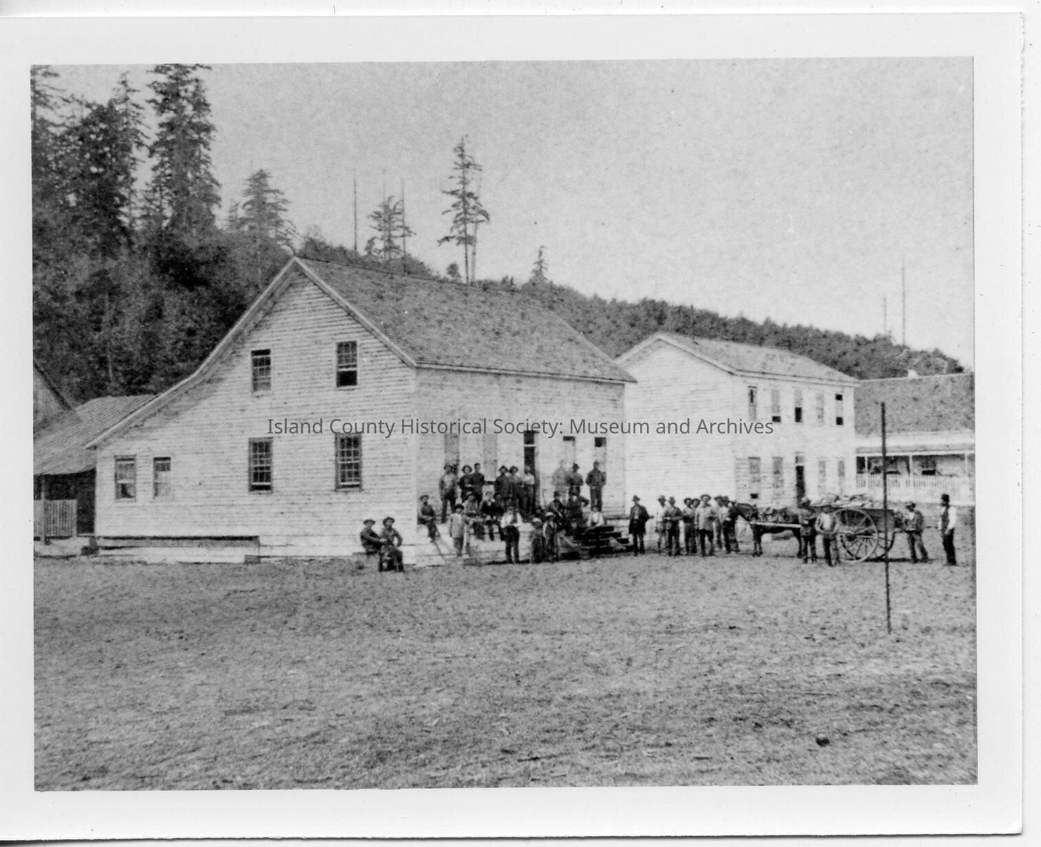 Camano Island, Utsalady Sawmill. Two houses with group of men in front, horse and wagon (image of AT 66)