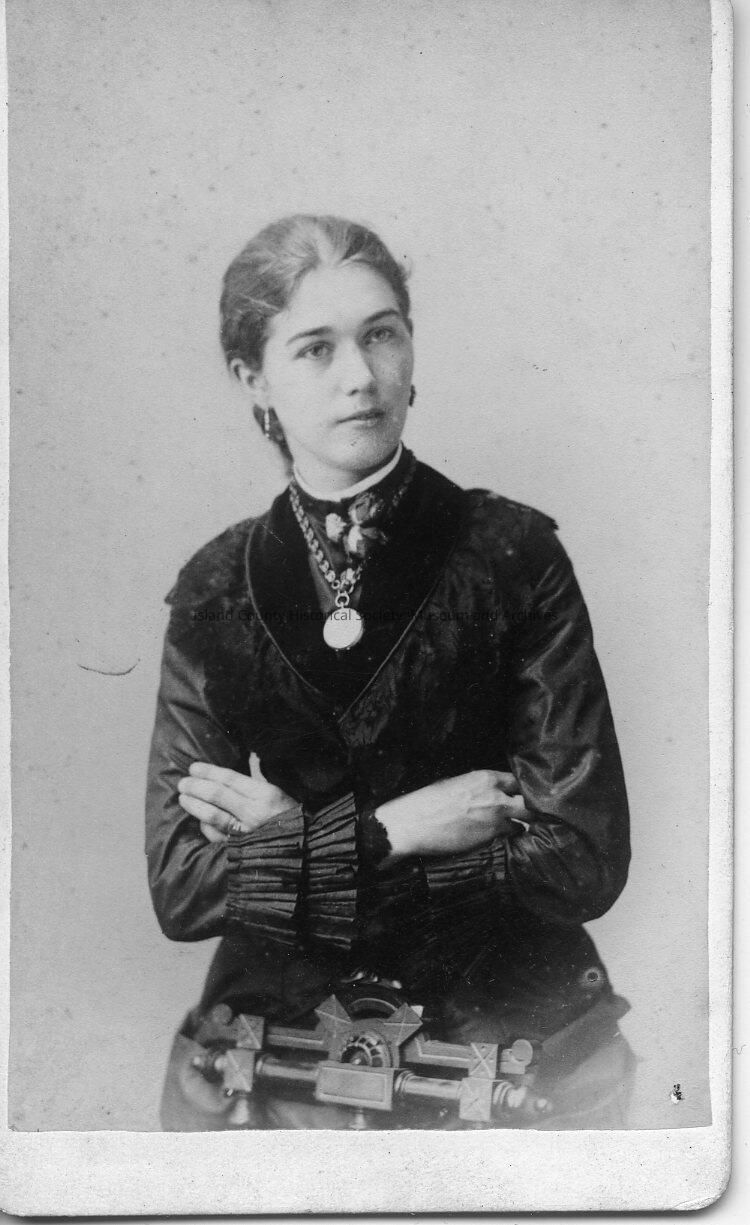 A photo of a young woman, with her arms crossed. A note on the front says "16A Unknown girl, from Coupe Family Album 13. G.R. Perry. Photographic Art Gallery, Norfolk, Simcoe, Ontario, Can."Made/Created