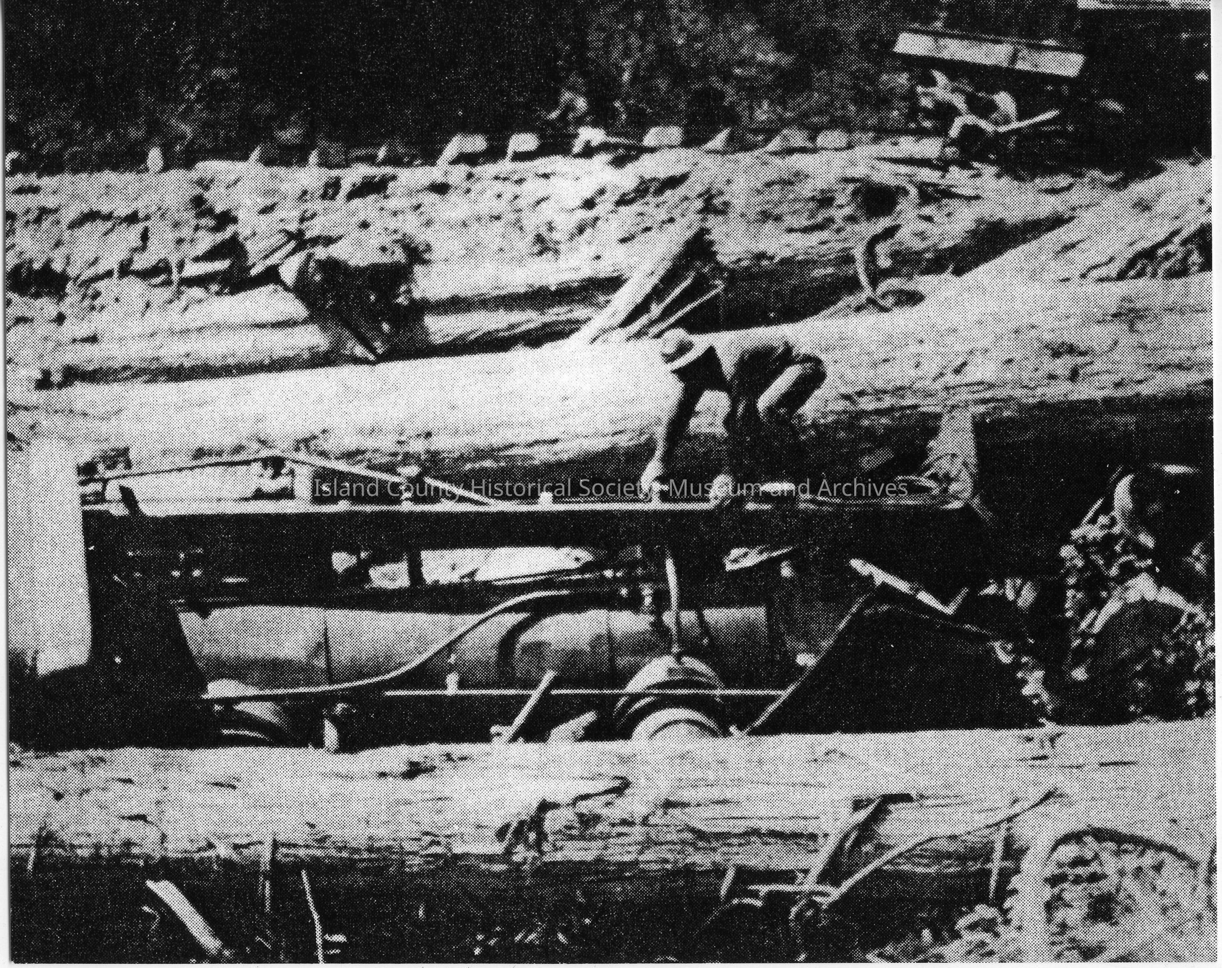 Black and white photo of men on logs, working on a machine of some sort. Probably at a logging camp. Horse on the hill in back and probably a wagon.Made/Created