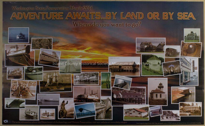 Adventure Awaits...By Land or By Sea; Washington State Preservation Month - 2014. Color poster.