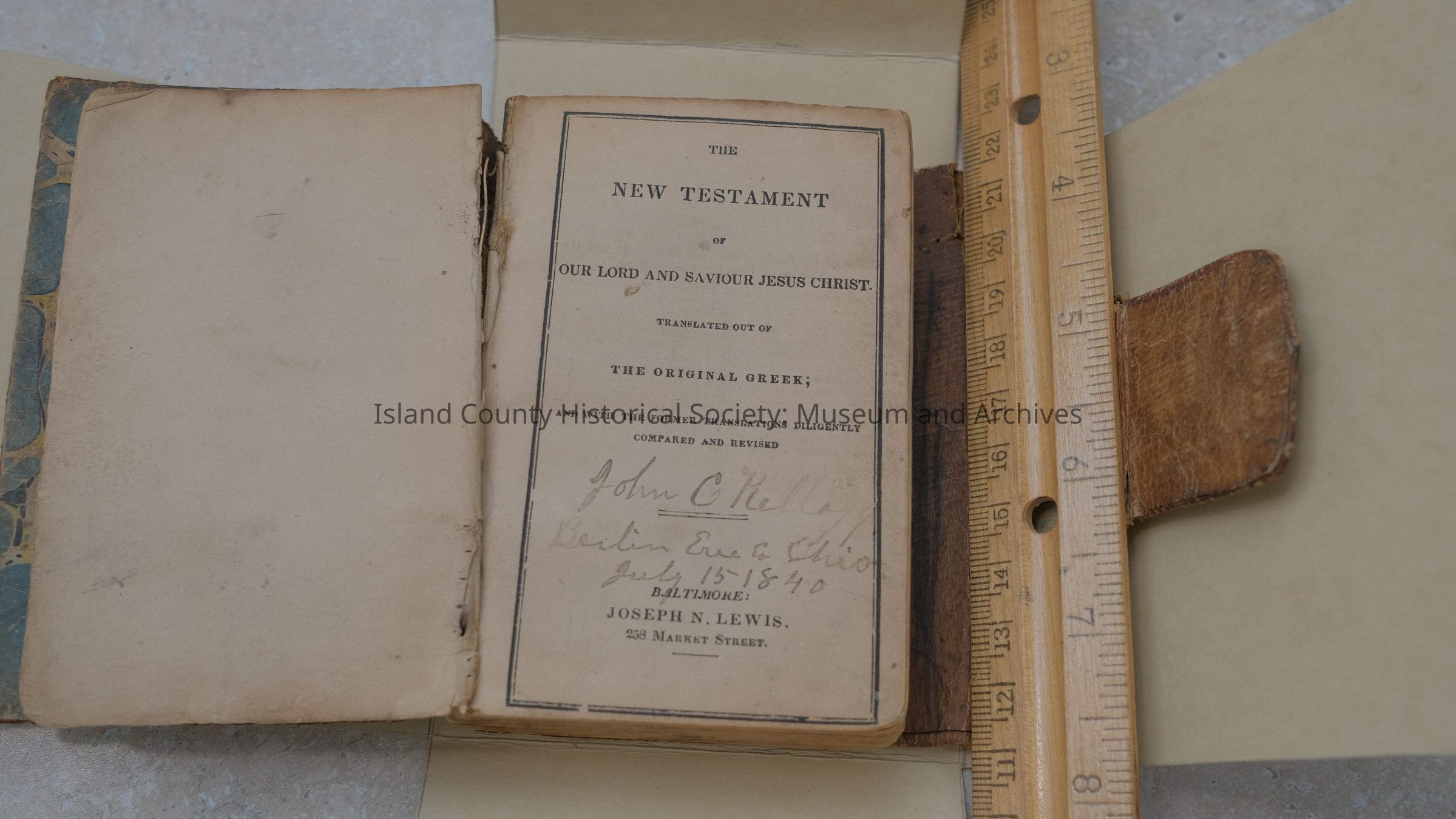 (no author), The New Testament, Jospeh N. Lewis, Baltimore, (no date; inscription: John C. Kellogg Berlin, Erie Co. Ohio July 15 1840; typed on back: New Testament brought from Erie County, Ohio, by Dr. John C. Kellogg to Whidbey Island, 1853; gift of G.A. Kellogg 1963). (rebind) Old: 94 New: 2016.033.001 20.27Lexicon