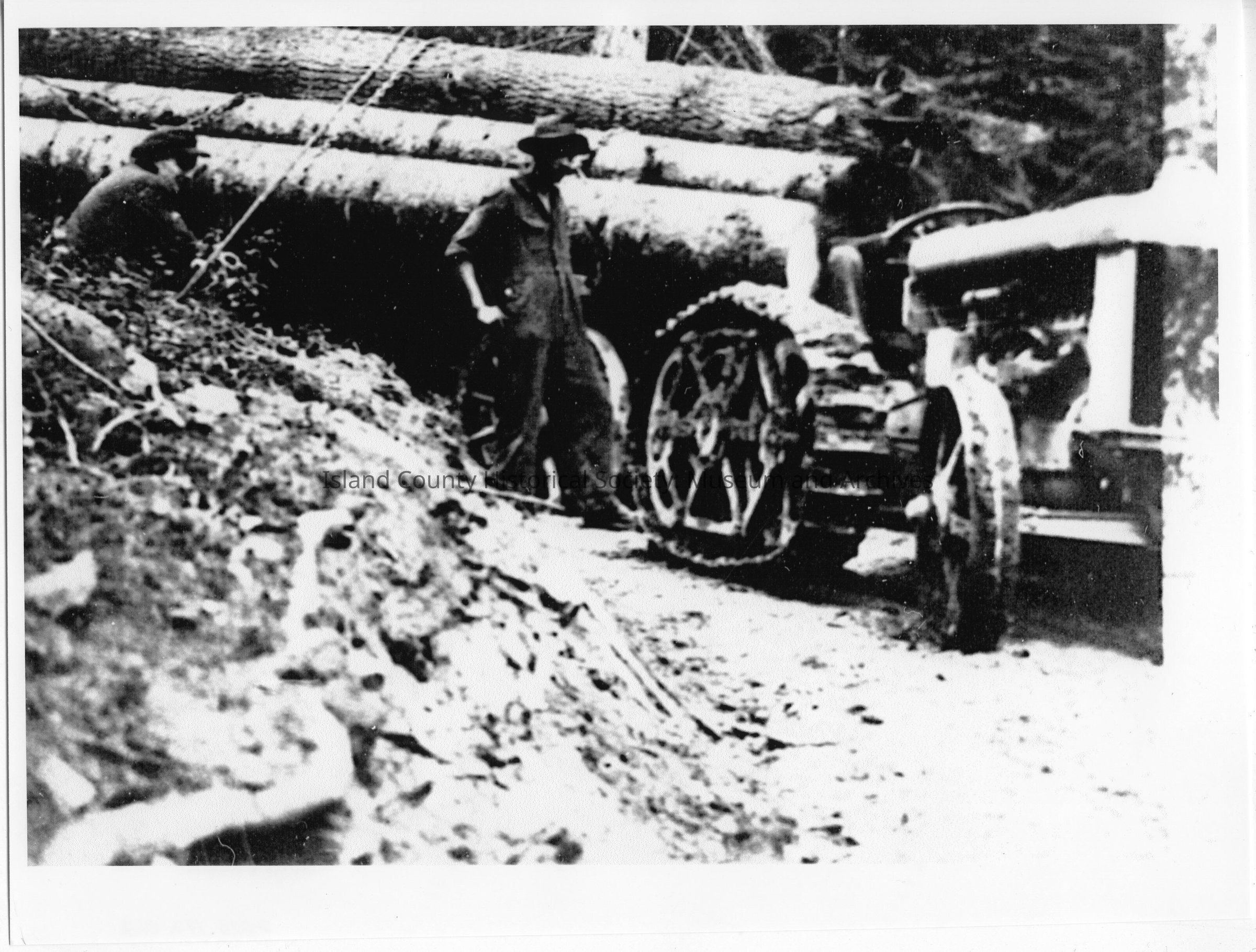 Black and white photo of men beside logs, which are on a flatbed attached to a tractor. Probably at a logging camp.