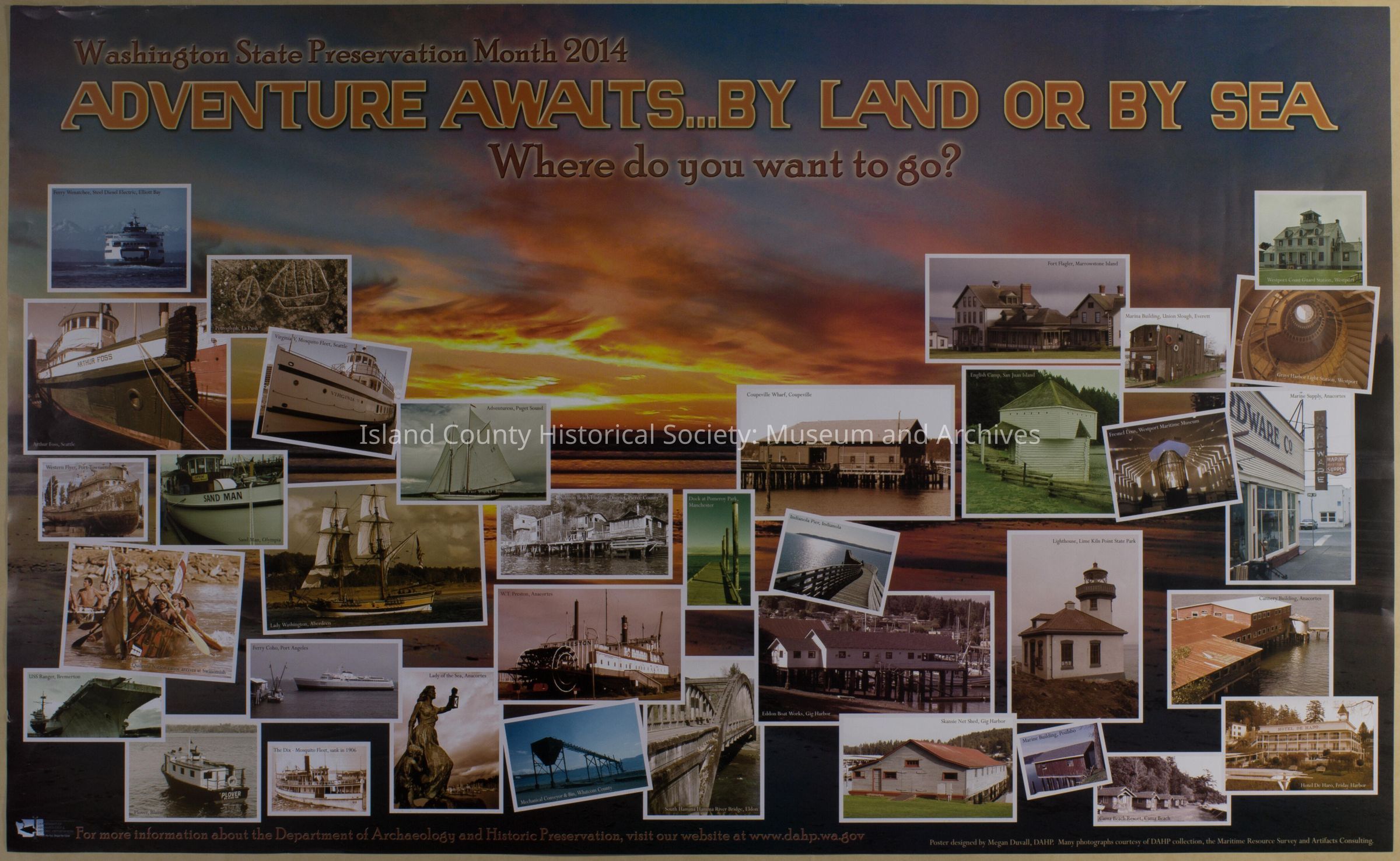 Adventure Awaits...By Land or By Sea; Washington State Preservation Month - 2014. Color poster. Duplicate of 2015.006.004a