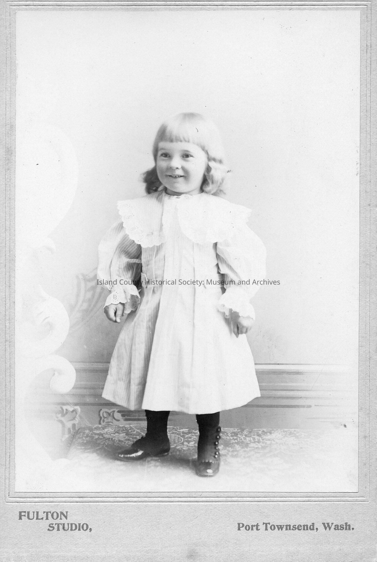 A photo of a young girl standing up. A note on the front says "19. Unknown Girl, from Mary Coupe Family Album 14. Fulton Studios, Port Townsend." A note on the back says "23_____Album 14. (Note -- 24A & 24B are listed as not found. Georgie Ammon, Gillespie Hancock."Made/Created