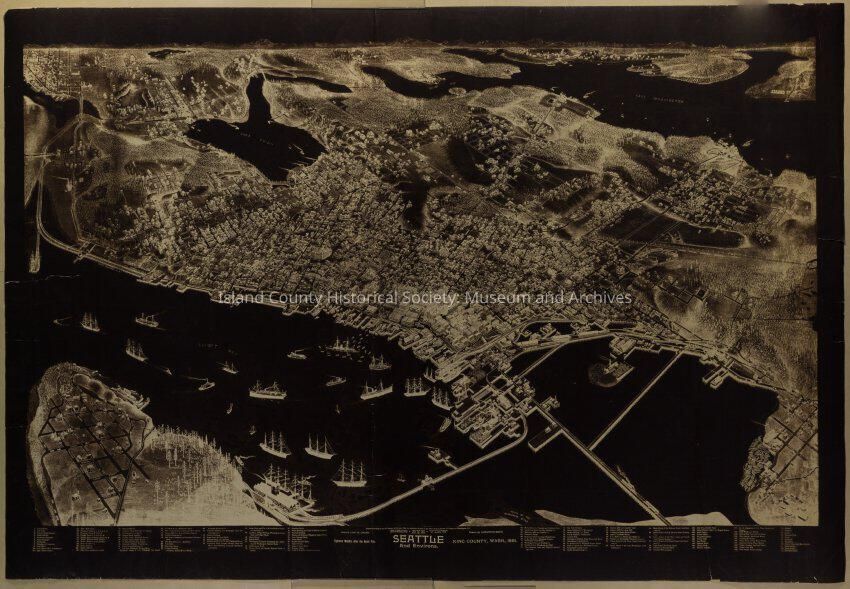 Bird's Eye view of Seattle, drawing; brown background; 1891