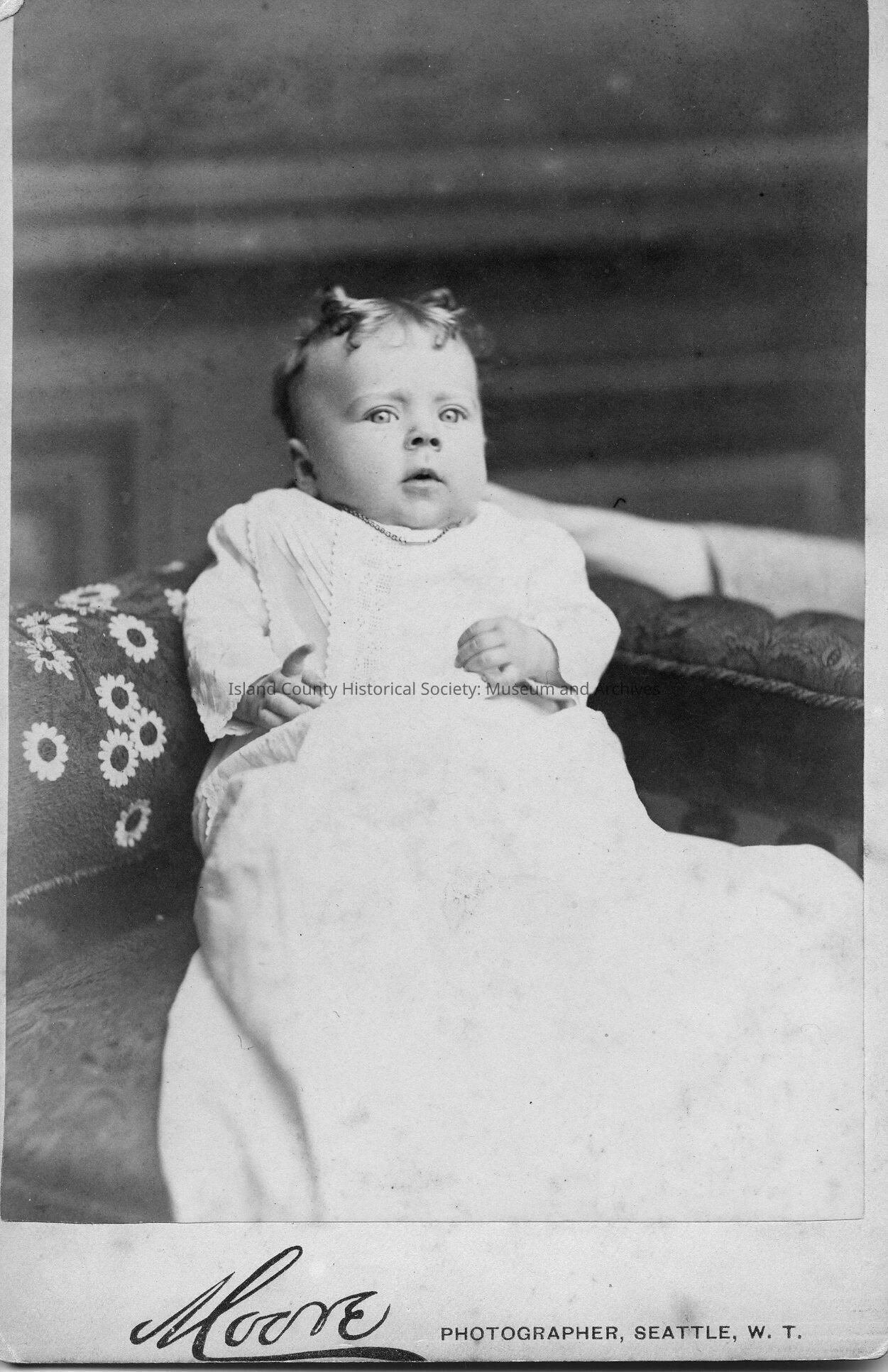 A photo of a baby. A note on the front says "22 Unknown woman and baby, from Mary Coupe Family Album 14.Note on back: See 26B, from album 12. Moore, Photographer, Seattle, W.T."Made/Created