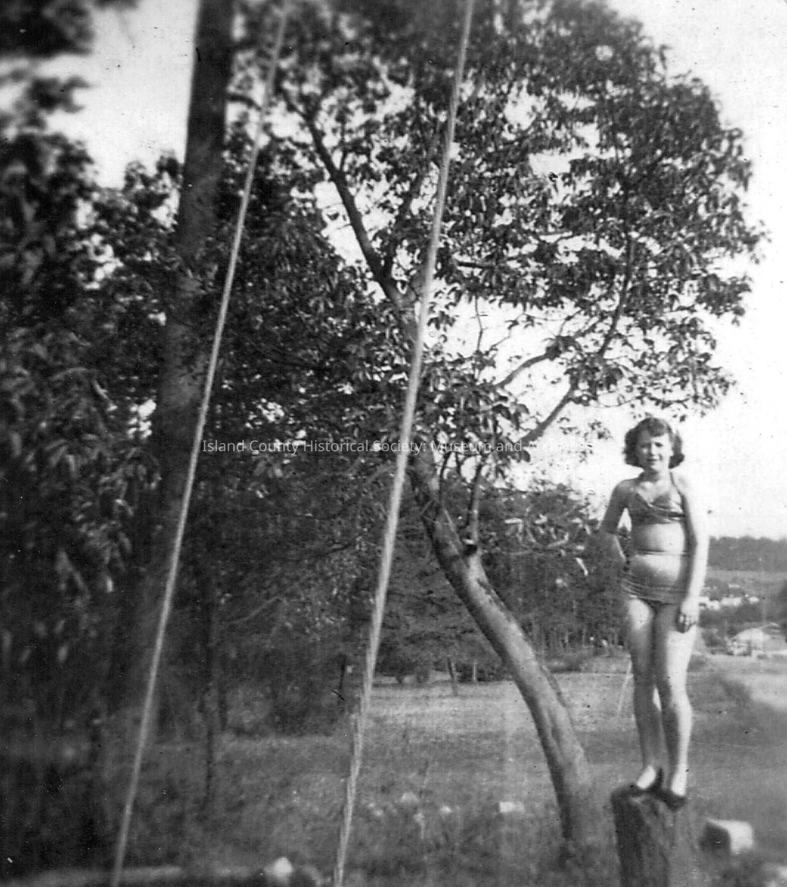 Black & white photo of Mary Fullington as a young girl. She is wearing a two-piece bathing suit and standing on a stump in a treed field. The ropes of a rope string are in the foreground of the picture. No date.