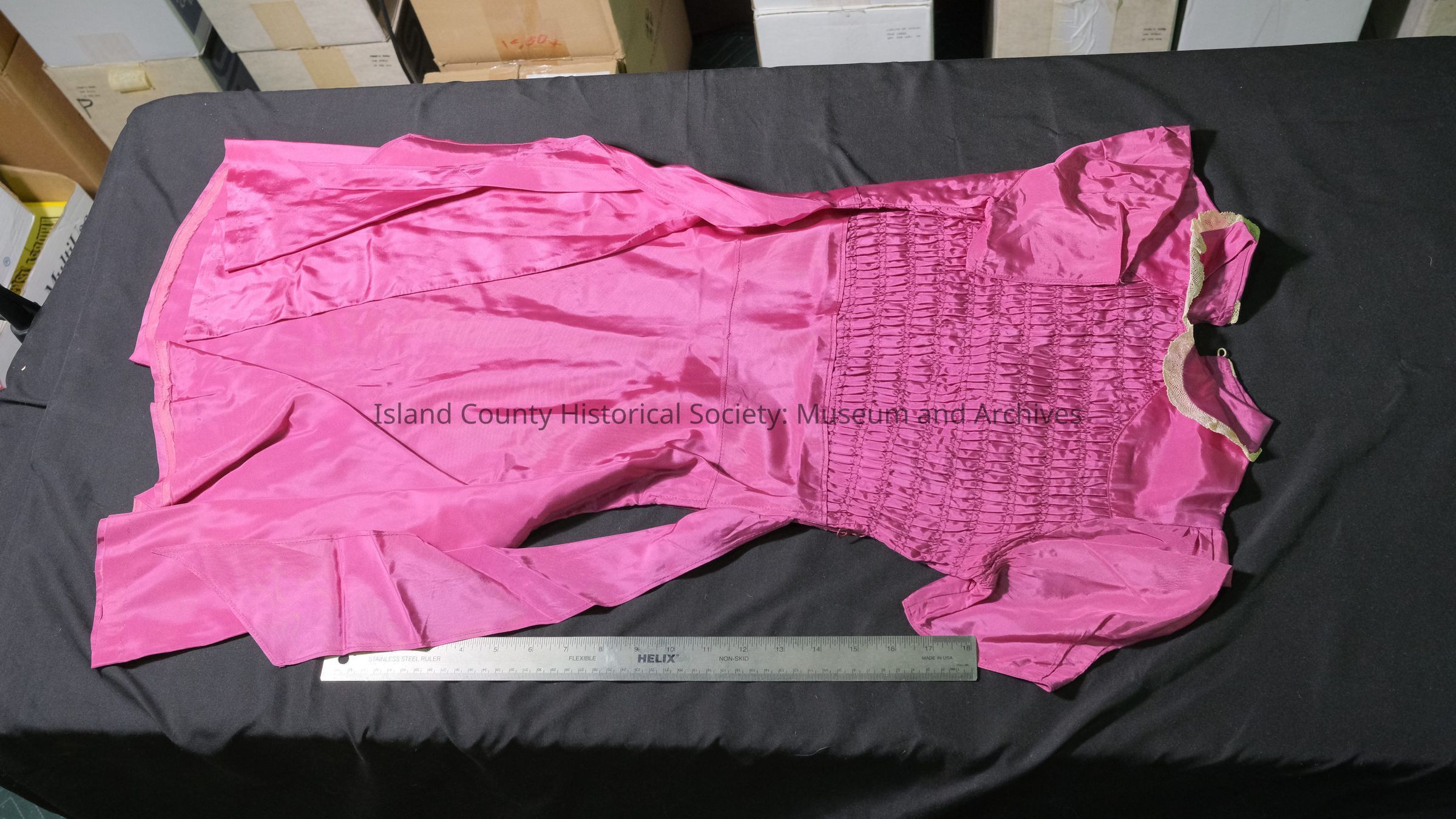 Cerise girl's dress with shirred front and white lace on collar.