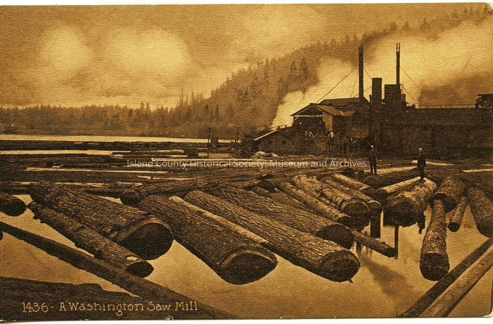 Black and white photo of two men standing on logs in the water in front of a lumber/sawmill on the coast. the caption reads: "1436 - A Washington Saw Mill"