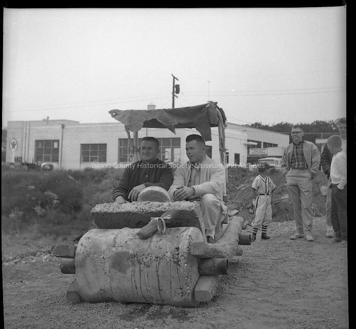 A print of a negative of two men sitting in the Flintstone Car in Oak Harbor. Handwritten on a note says "Tom Clark, Sheriff, Negative."Collection