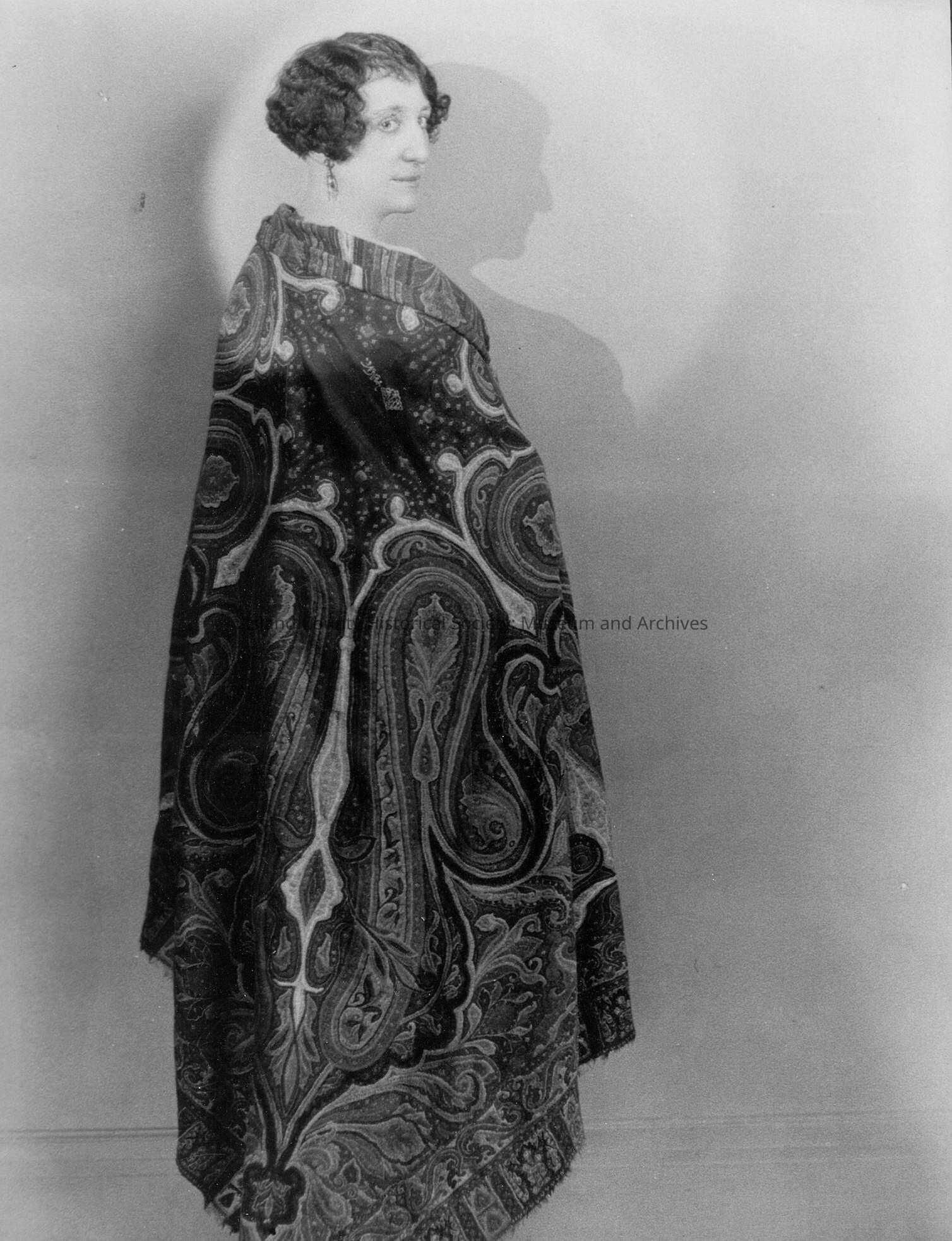 Black & white photo of Emily Wilson Swift's paisley shawl. Shawl modeled by daughter Maude Fullington. No date. The photo was originally stored in the Mary Fullington folder in the Archives Storeroom.