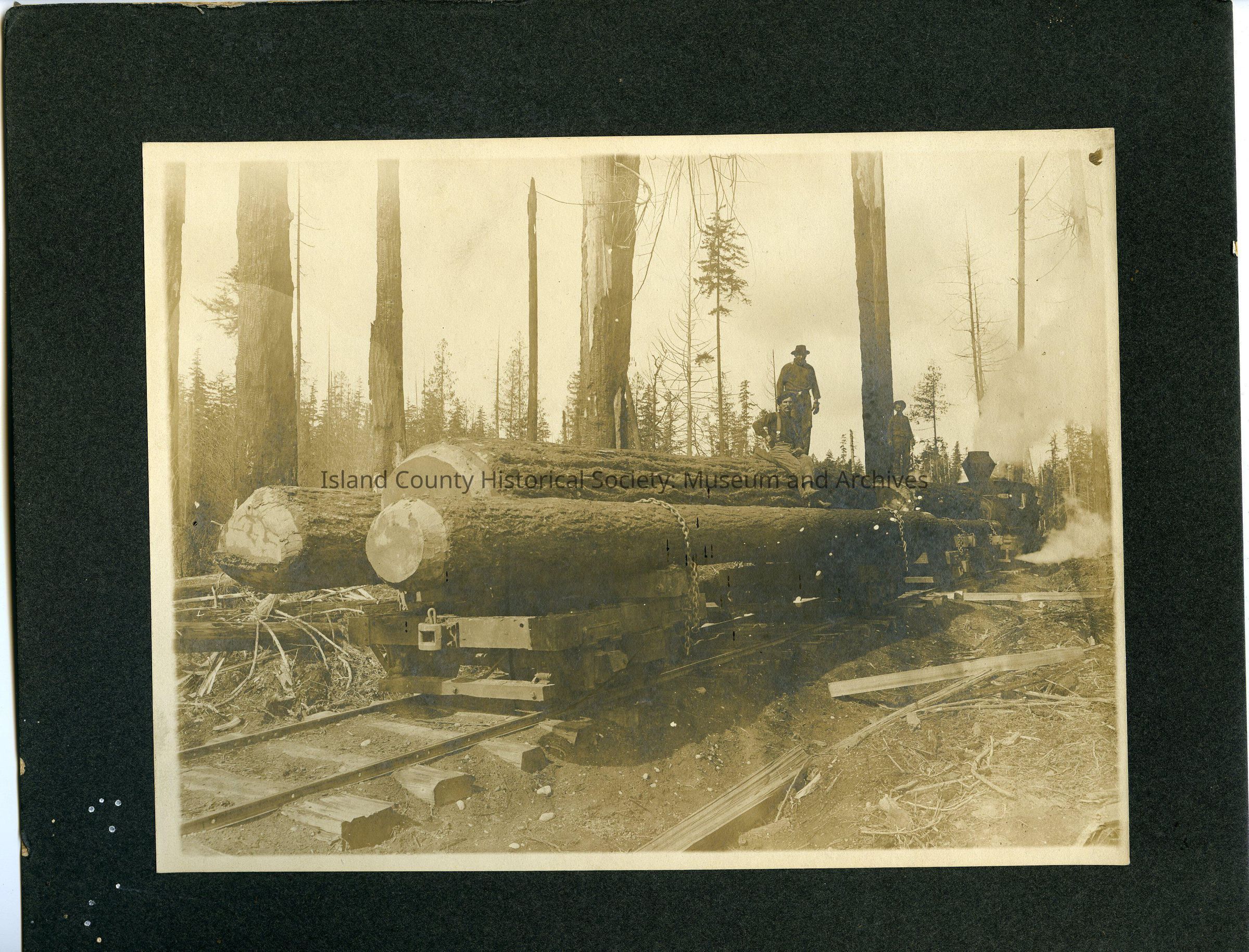 Black and white photo of men on a large log loaded on a flatbed railcar with two other logs on a railway; engine/locomotive in background.