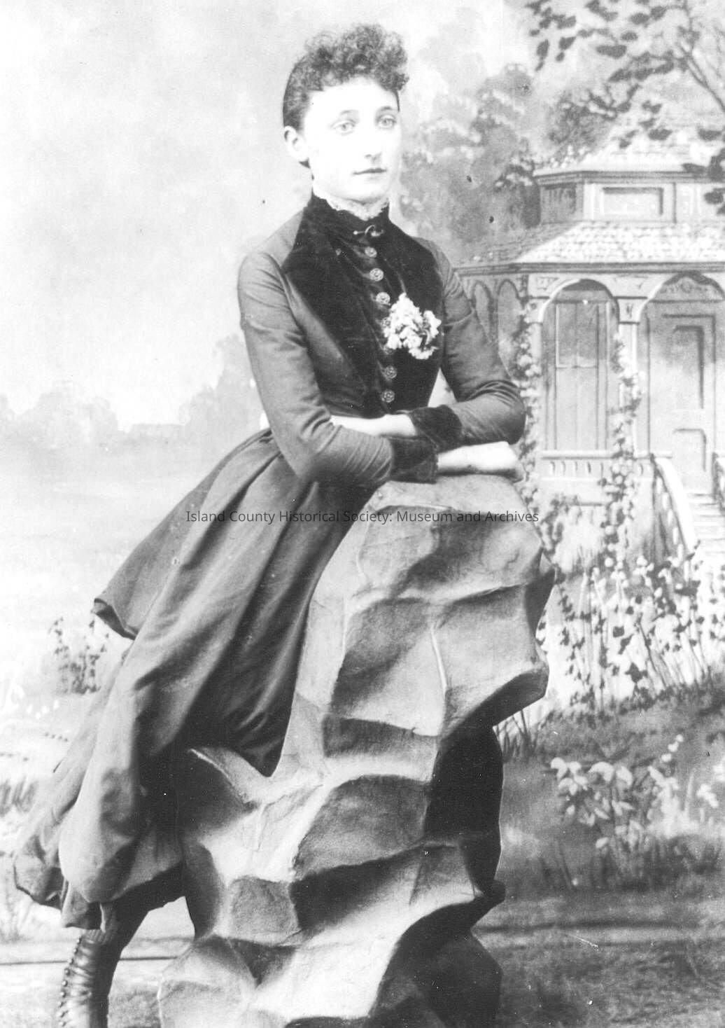 Black & white full length portrait photo of Maude Swift Fullington, c,1890. Her brown curly hair is pinned up and her arms are crossed in front of her waist. She is wearing a long dark colored dress with a high collar and large buttons down the front. Her right leg is shown behind her wearing a buttoned boot. She is leaning on an inregular shaped rock-like lecturn.