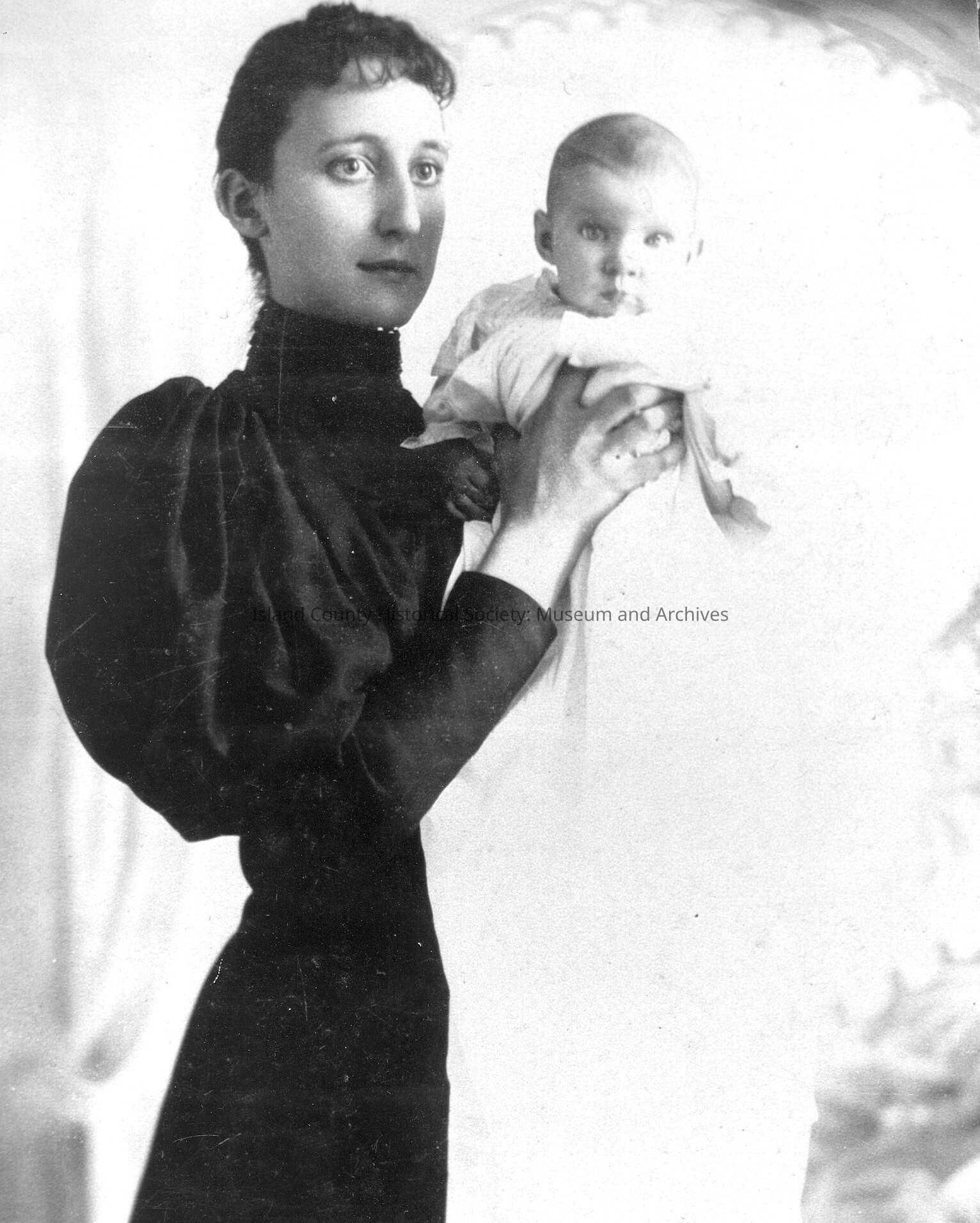 Black & white portrait photo of Maude Fullington holding a baby Mary Fullington in her arms. Taken 1898. Maude is wearing a dark, high-collared dress with puffed long sleeves. Her hair is pinned up. Maude is holding baby Mary up and facing her toward the camera. Mary has short baby hair and is wearing a long white dress.