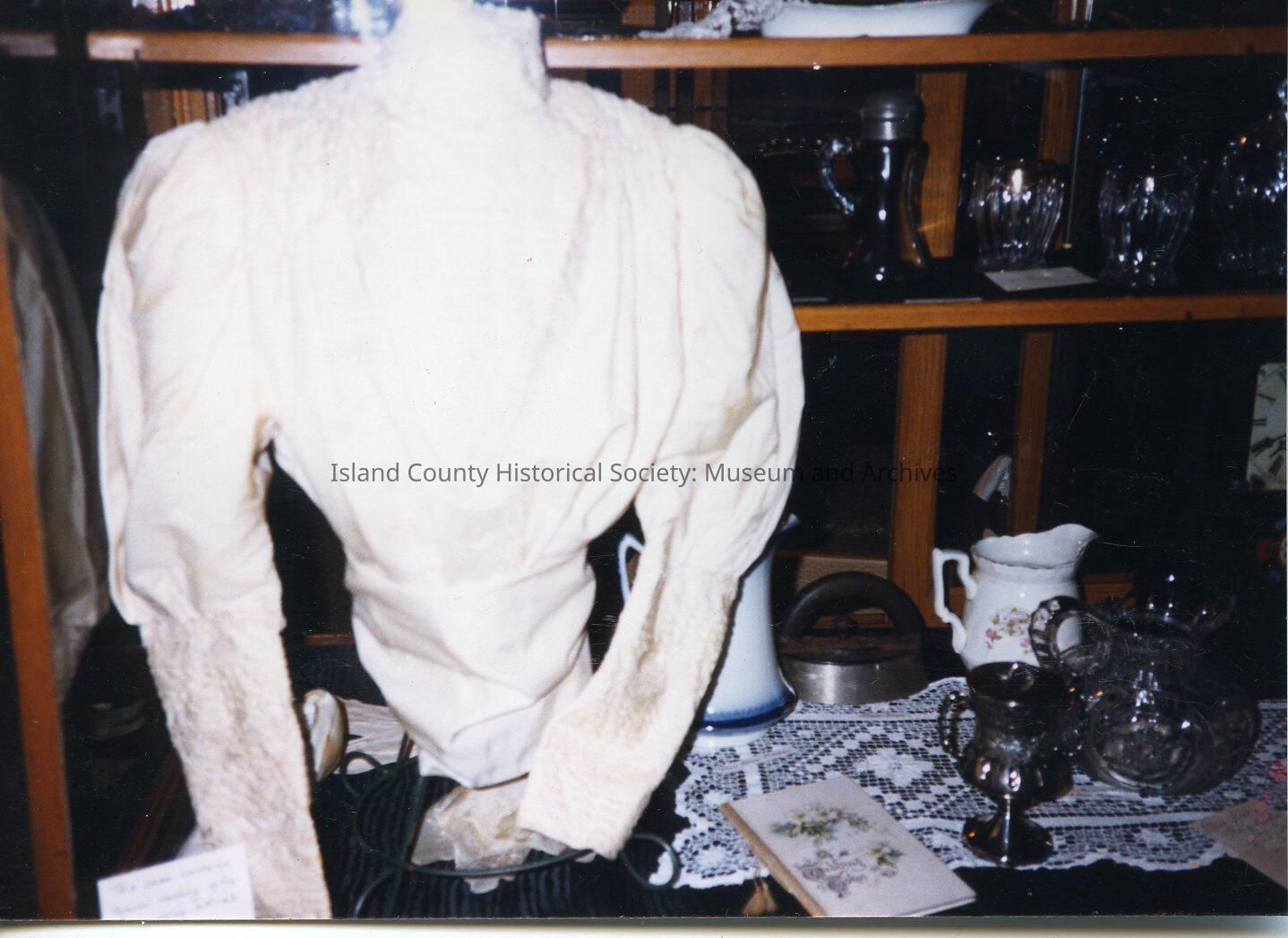 A colored photo of a wooden counter, holding a white wedding top, and other glass and silver things, on a glass counter. Handwritten on the back is "1988 Museum Case - Wedding - Lower Left."