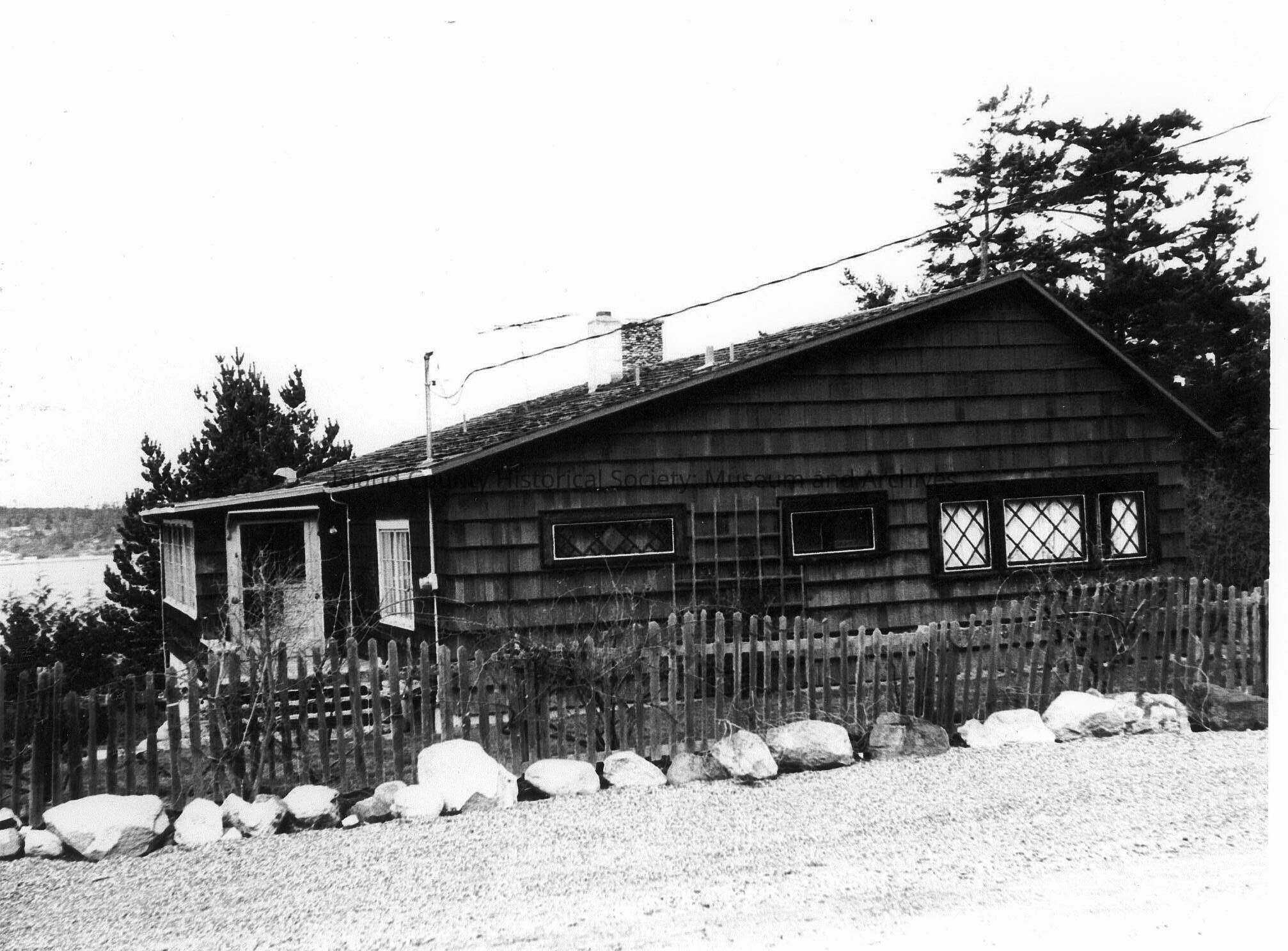 Black & white photo of the Fullington House. No date. The view is from the left side of the house looking toward the water in the distance. Large rocks & a picket fence are in the foreground. The house is sided in cedar shakes and has windows with diamond pane insets.